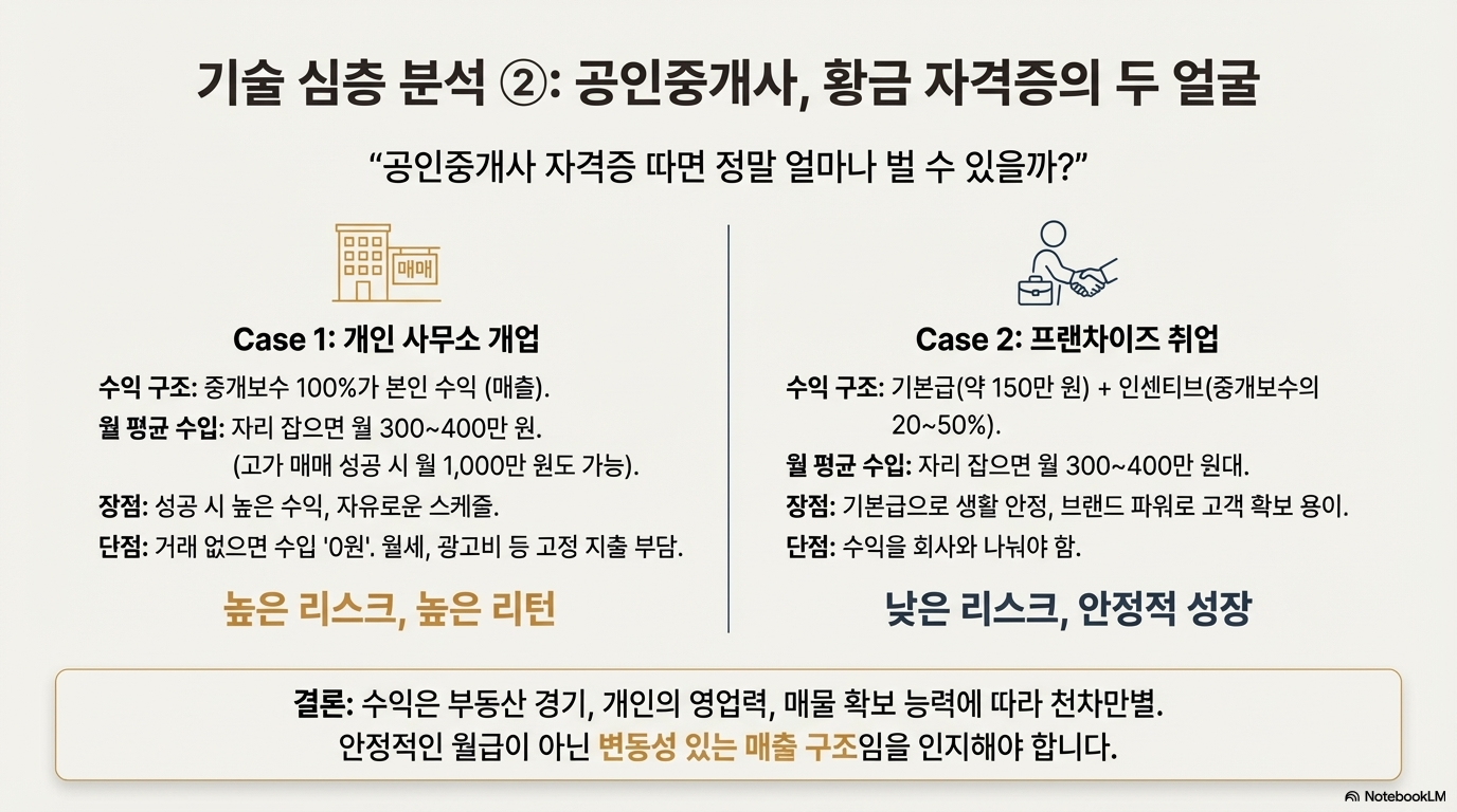 • 프랜차이즈 취업: 월 150만 원 정도의 기본급으로 최소한의 생활 안정을 보장받지만, 중개보수의 20~50%만 인센티브로 가져가므로 수익에 한계가 있습니다. 위험 부담이 적은 대신 큰 성공도 어렵습니다.
