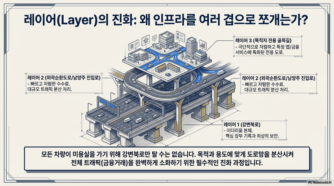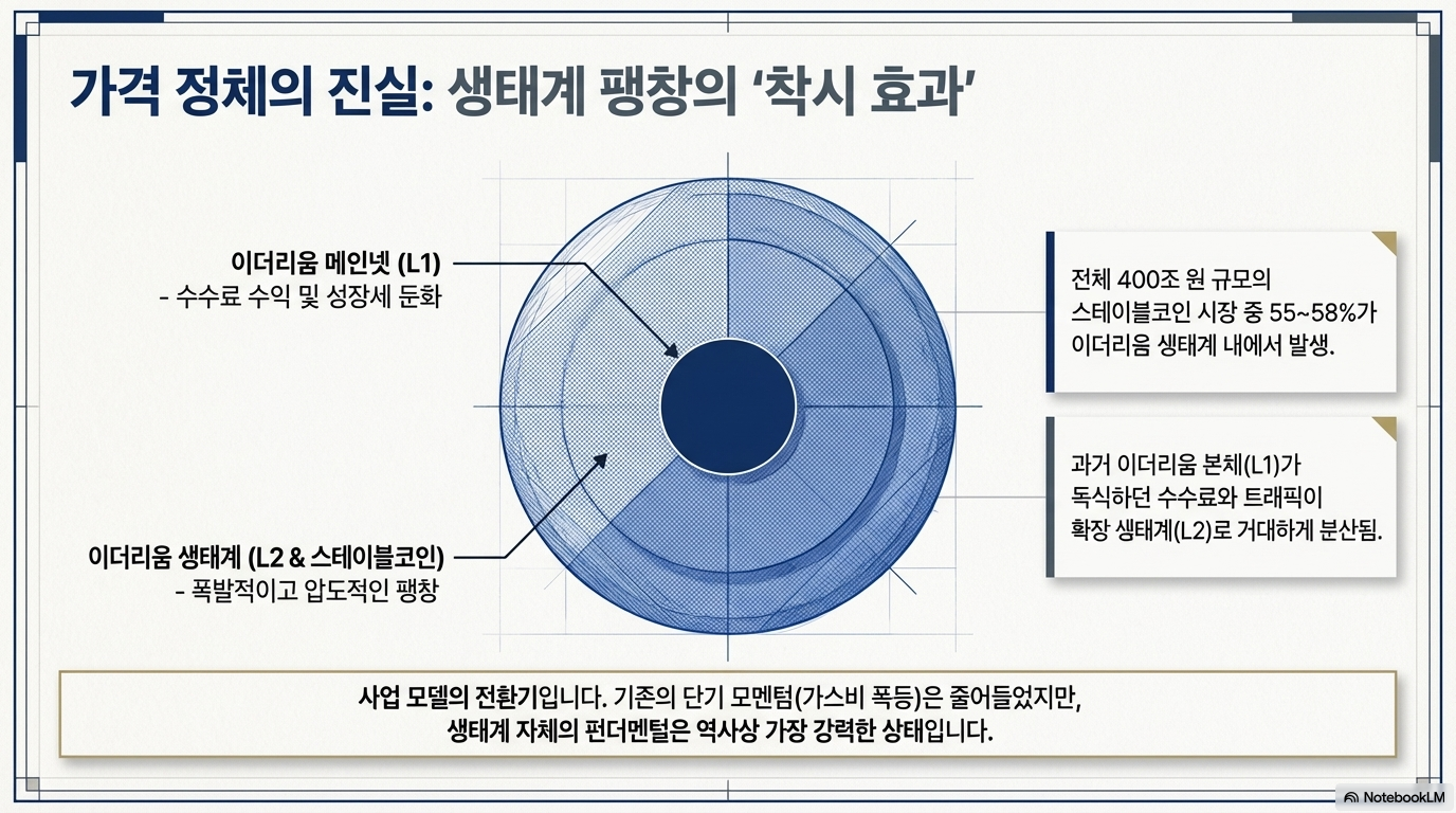 이더리움 본체(L1)가 '강변북로'라면, L2와 L3는 트래픽을 분산하기 위해 건설된 '주변 고가도로와 골목길'입니다. 네트워크가 너무 붐비고 가스비가 비싸지자 트래픽을 주변 도로로 분산시킨 것인데, 이 과정에서 생태계 전체의 교통량은 폭증했지만 주인공인 강변북로(L1)의 직접적인 수익 capture와 주목도는 일시적으로 분산되는 **'착시 효과'**가 발생했습니다.