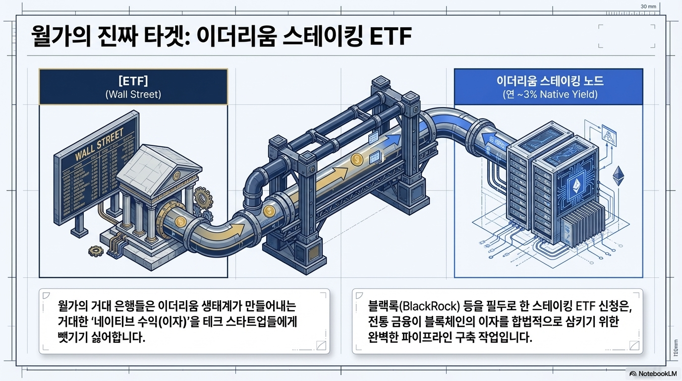 이러한 '주권 유지형 수익 모델'은 기관 투자자들에게 엄청난 매력으로 다가옵니다. 월가가 비트코인 ETF 이후 이더리움 스테이킹 ETF에 사활을 거는 이유도 바로 여기에 있습니다. 디지털 자산의 소유권은 그대로 가지면서, 네트워크 운영 기여를 통해 안정적인 현금 흐름을 창출하는 **'디지털 자산의 이자 상품화'**가 가능하기 때문입니다.