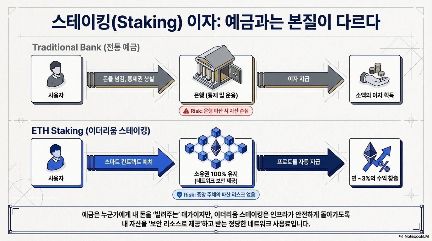 많은 이들이 스테이킹(Staking)을 은행 예금과 혼동하지만, 그 내면의 메커니즘은 완전히 다릅니다. 은행 예금은 소유권을 은행에 이양하고 그 대가로 이자를 받지만, 스테이킹은 자산의 **'통제권(Sovereignty)'**을 온전히 유지한 채 네트워크 보안 리소스를 제공한 대가로 받는 '사용료' 개념입니다.