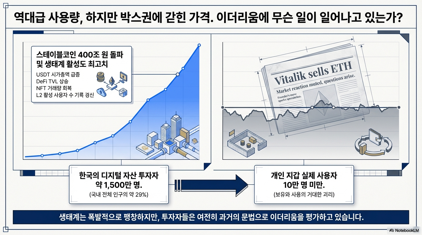 비트코인이 신고가를 경신하며 화려한 조명을 받는 사이, 가상자산 시장의 기축 통화 역할을 하는 이더리움은 상대적으로 무거운 움직임을 보이고 있습니다. 네트워크 사용량은 연일 역대 최고치를 기록하고 있음에도 불구하고, 왜 가격은 투자자들의 기대에 부응하지 못하고 박스권에 머물러 있는 걸까요?