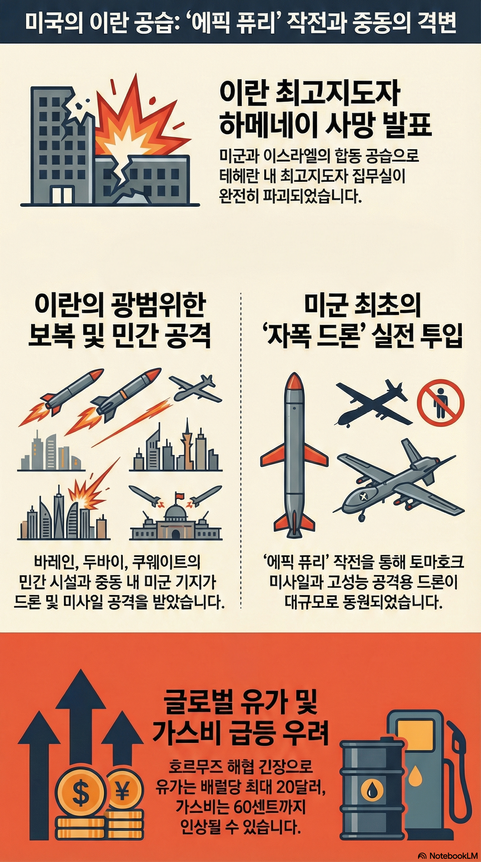 전 세계가 잠든 새벽 2시 30분, 백악관에서 발표된 도널드 트럼프 대통령의 영상 메시지는 국제 안보 지형의 근간을 뒤흔들었습니다. 미군과 이스라엘군의 합동 군사 작전인 '에픽 퓨리(Operation Epic Fury)'를 통해 이란의 최고 지도자 아야톨라 알리 하메네이가 사망했다는 소식은 단순한 뉴스 그 이상의 충격이었습니다.