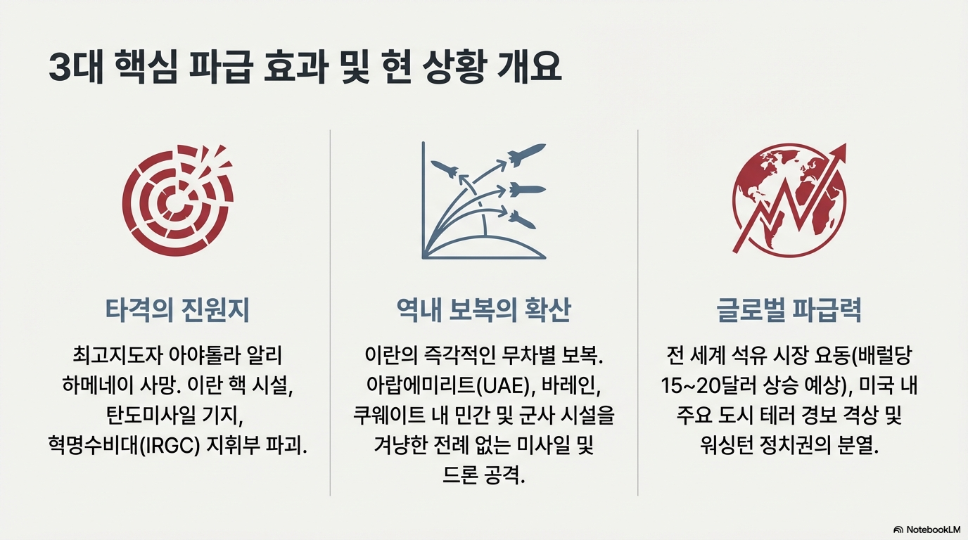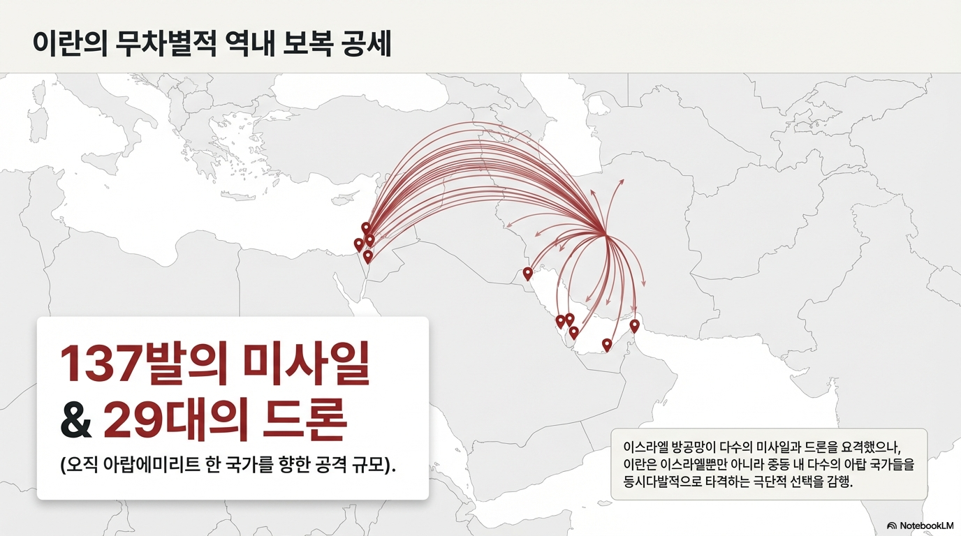 지도부를 잃은 이란의 보복은 예상보다 훨씬 더 무모하고 광범위했습니다. 보복의 대상은 이스라엘에 국한되지 않았으며, 중동의 전략적 요충지에 위치한 인접 아랍 국가들의 민간 시설을 무차별적으로 겨냥했습니다.