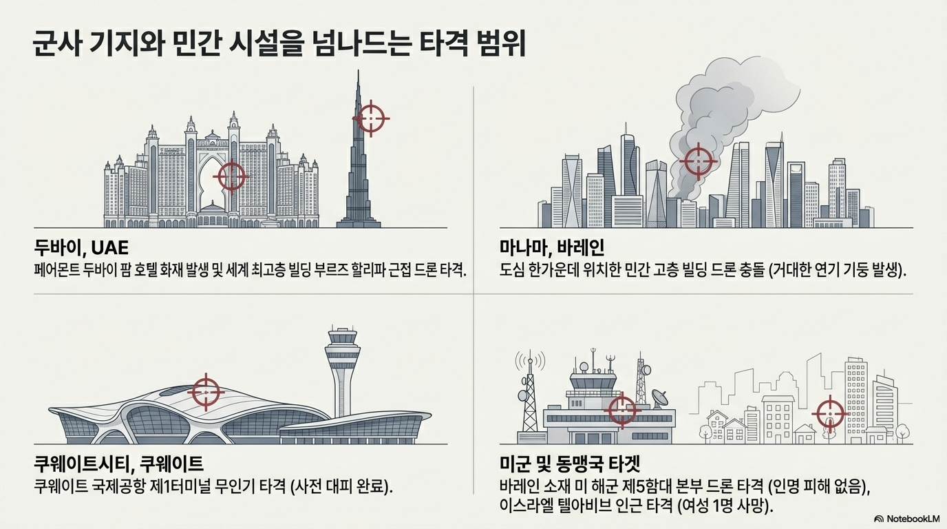 - 바레인 및 기타: 바레인 도심의 고층 빌딩이 타격을 입었으며, 바레인 소재 미 해군 제5함대 본부에도 드론이 충돌했으나 다행히 인명 피해는 보고되지 않았습니다.
