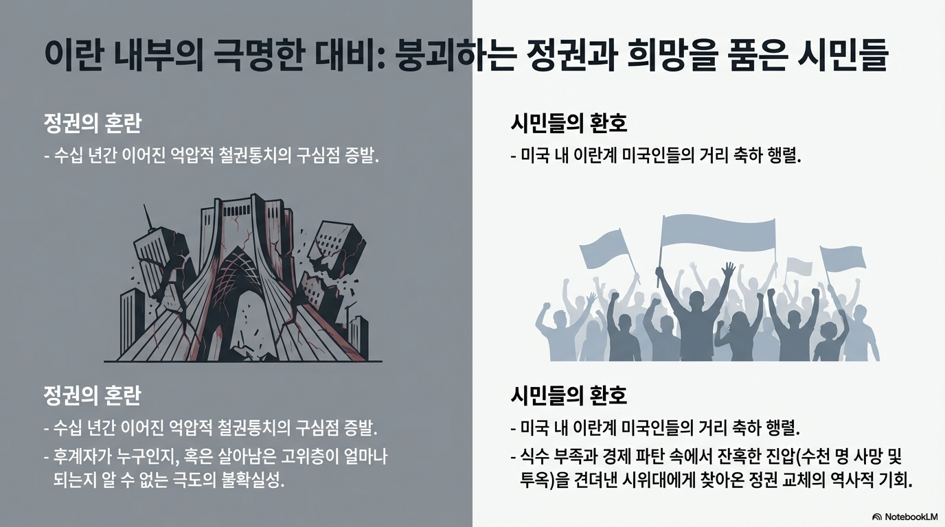 이 지점에서 주목할 점은 미 행정부가 이란 군부를 향해 던진 최후통첩입니다. **"무기를 내려놓는다면 완전한 면죄부(Total immunity)를 줄 것이나, 그렇지 않으면 확실한 죽음(Certain death)을 맞이할 것"**이라는 메시지는 무너진 지휘 체계 내부의 분열을 유도하는 고도의 심리전입니다. 다만, 리처드 엔젤 기자의 분석처럼 정권에 대한 대중의 불만(식수 부족, 경제 파탄)이 높다고 해서, 이 권력 공백이 반드시 평화로운 민주주의로의 전환을 보장하지는 않는다는 점을 유의해야 합니다.