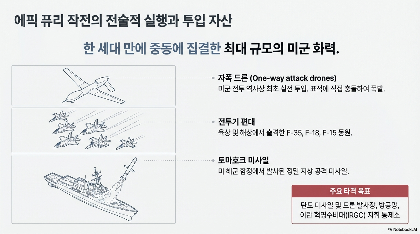 기술적 관점에서 '에픽 퓨리' 작전은 현대전의 패러다임이 전환되었음을 공포했습니다. 미 중앙사령부는 이번 작전에서 소위 '자폭 드론'이라 불리는 **편도 공격 드론(One-way attack drones, 배회형 배격 무기)**을 미군 역사상 처음으로 실전에 투입했습니다.