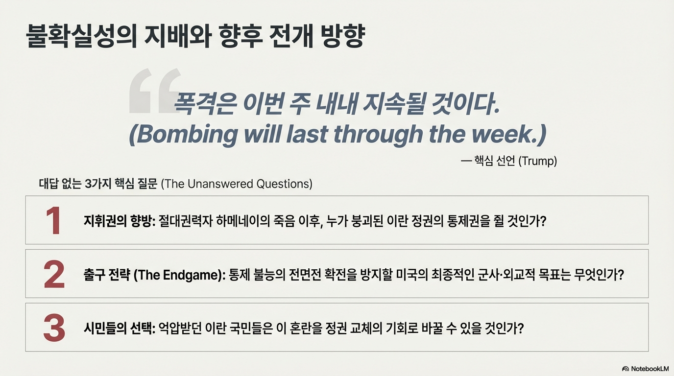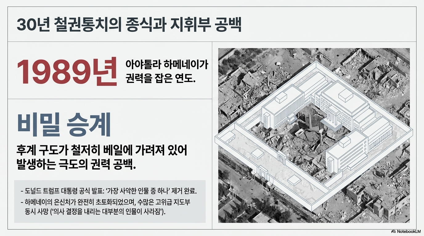 크리스틴 웰커 기자가 전한 바에 따르면, 트럼프 대통령은 이번 공격으로 "결정을 내리는 사람들 대부분이 사라졌다"고 언급했습니다. 이는 단순한 하메네이의 죽음을 넘어 이란 정권의 신경망 자체가 제거되었음을 의미합니다. 하메네이는 평소 후계 구도를 철저히 비밀에 부쳤기에, 현재 이란은 건국 이래 유례없는 권력의 '블랙홀'에 빠져 있습니다.