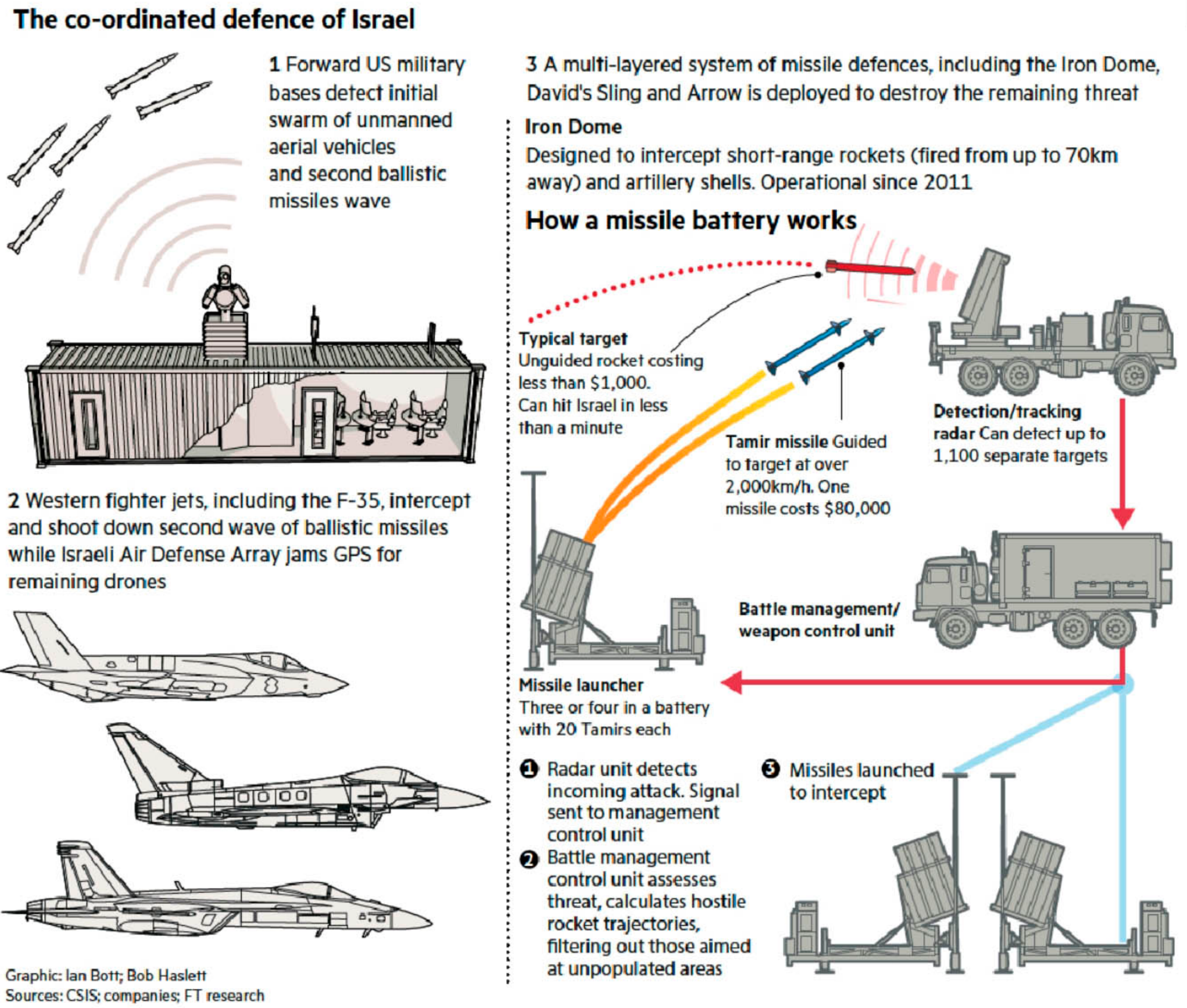 - 다층 방어 시스템은 아이언 돔, 데이비드의 슬링, 애로우를 포함하여 남은 미사일을 파괴하는 데 사용됩니다.