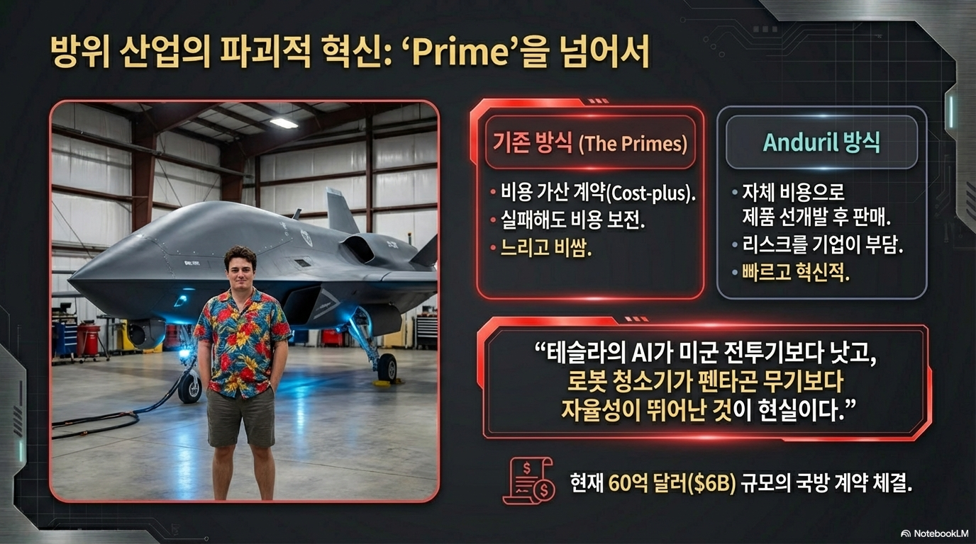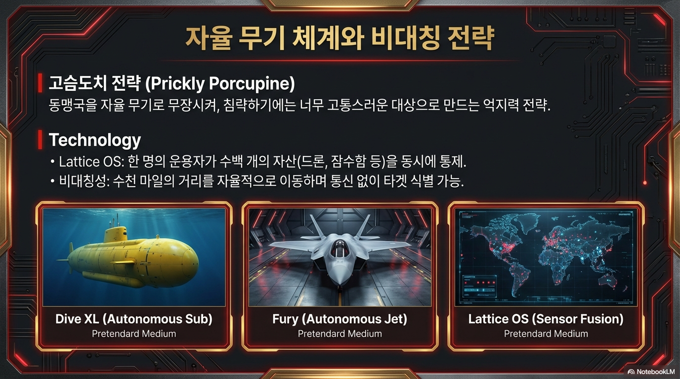 팔머 럭키(Palmer Luckey)가 이끄는 앤듀릴(Anduril)은 AI 기반의 자율 무기 시스템으로 전쟁의 문법을 바꾸고 있습니다. 제트 엔진을 장착한 요격 드론 **'로드러너(Roadrunner)'**와 무인 전투기 **'퓨리(Fury)'**는 인간 조종사를 위험에 빠뜨리지 않고도 강력한 **억제력(Deterrence)**을 제공합니다.