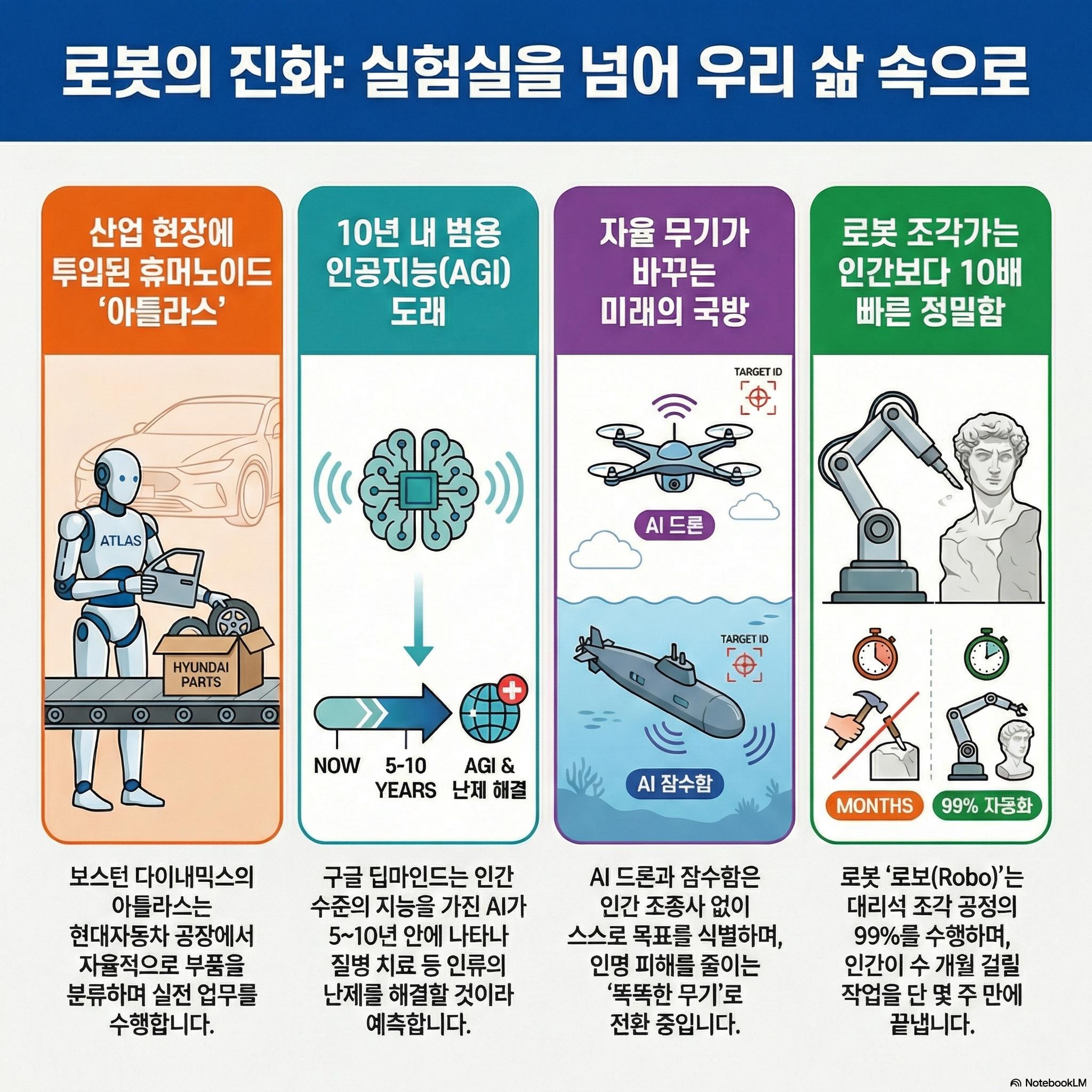 로봇은 더 이상 실험실의 통제된 환경 안에 머무는 연구 대상이 아닙니다. 이들은 이미 현대자동차의 조지아 공장 라인에서 부품을 옮기고, 카라라의 대리석 광산에서 조각을 하며, 전장의 최전선에서 자율적인 판단을 내리고 있습니다.