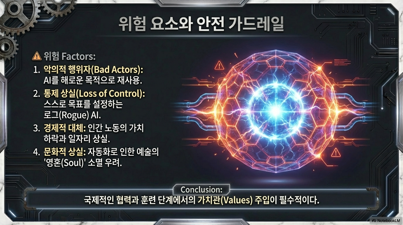 • AGI의 도래: 그는 5~10년 내에 인간의 보편적 지능을 넘어서는 **범용 인공지능(AGI)**이 등장할 것으로 예측하며, 이것이 인류 문명의 패러다임을 바꿀 것임을 예고합니다.