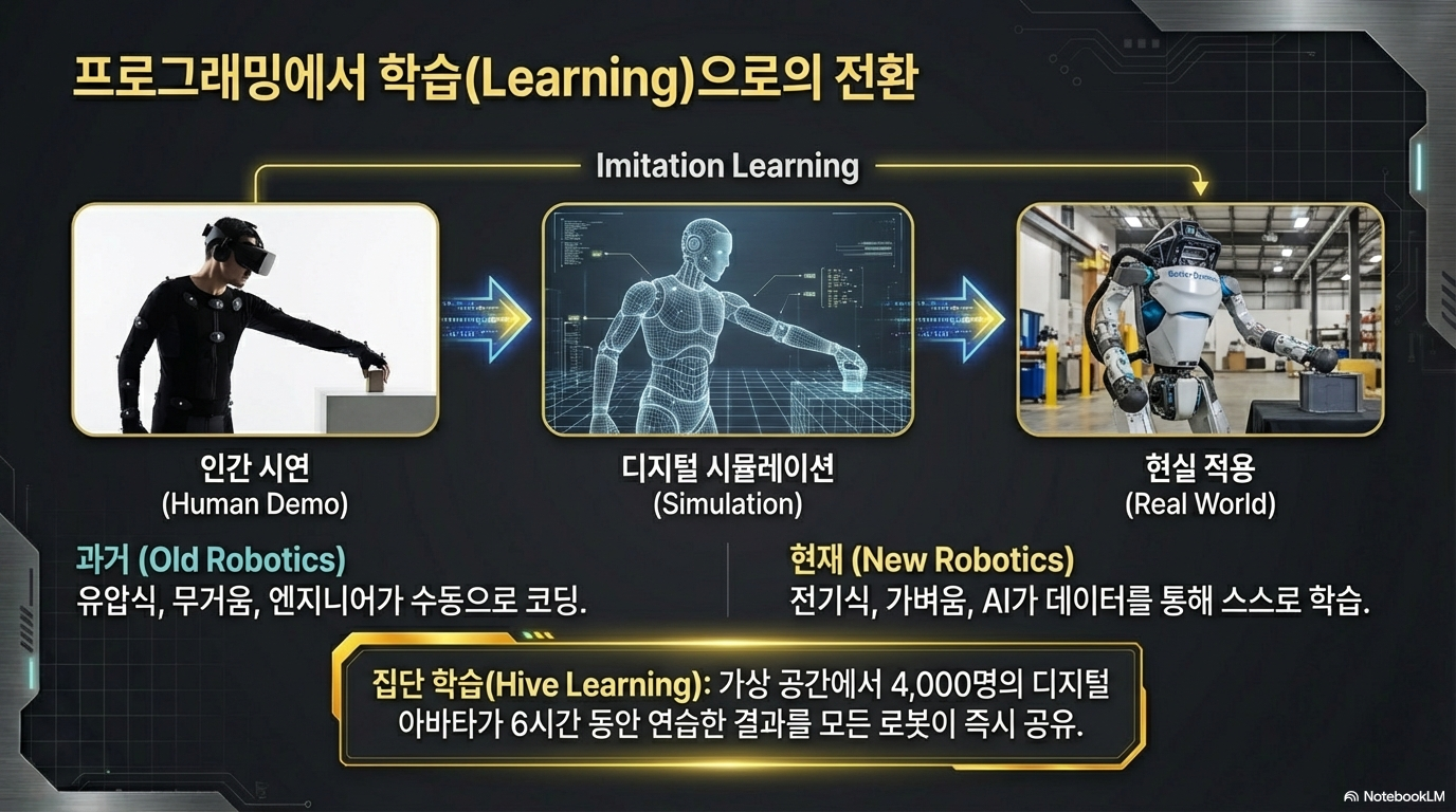 이 기술의 핵심은 **'합성 데이터(Synthetic data)'**를 통한 기하급수적 학습 능력에 있습니다. 가상 시뮬레이션 속에서 4,000대의 디지털 아틀라스는 단 6시간 만에 수천 번의 시행착오를 거치며 특정 동작을 완벽히 마스터합니다. 인간의 시연을 모방하는 것을 넘어, 스스로 최적의 경로를 찾아내는 이 과정은 로봇공학이 '지수적 곡선(Exponential curve)'에 진입했음을 상징합니다.