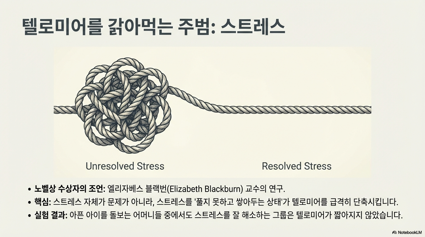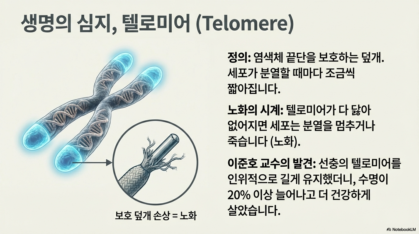 우리 세포의 수명을 재는 생체 시계, '텔로미어'. 하지만 이 텔로미어는 생명의 '양날의 검'과 같습니다. 텔로미어는 염색체 끝을 보호하는 캡으로, 세포가 분열할 때마다 짧아집니다. 이것이 짧아지면 노화가 오지만, 만약 무한히 길어진다면 세포는 불멸성을 얻어 암으로 폭주하게 됩니다.