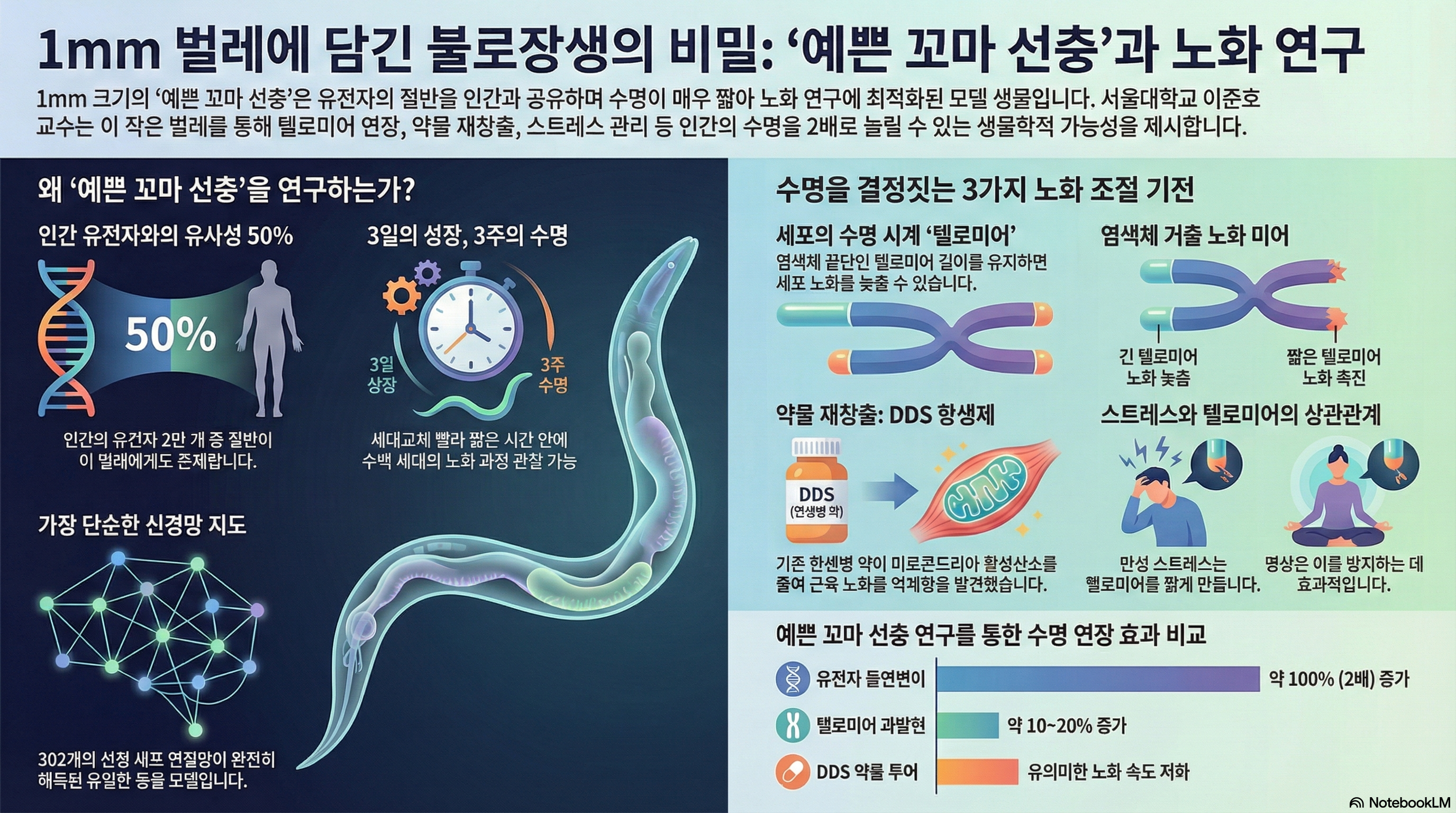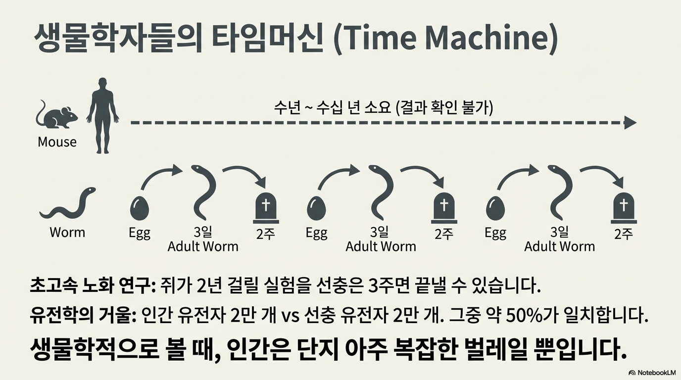 인류의 오랜 꿈, 바로 더 길고 건강한 삶입니다. 우리는 노화를 늦추고 질병 없이 오래 살 방법을 끊임없이 찾아왔습니다. 그런데 이 거대한 질문의 해답을 엉뚱하게도 흙 속에 사는 길이 1mm짜리 작은 벌레가 쥐고 있다면 어떨까요?
