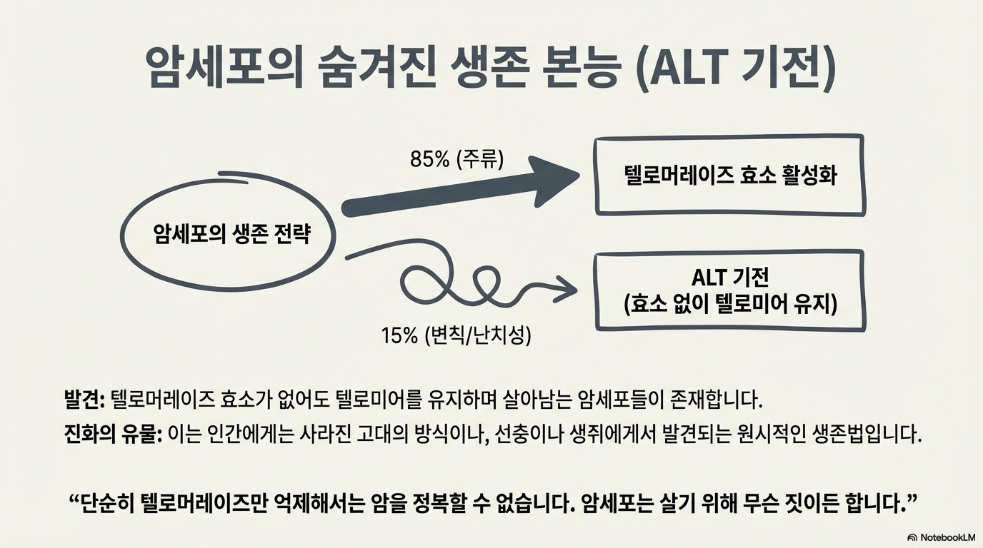 약 85%의 암세포는 '텔로머레이스'라는 효소를 다시 활성화해 짧아진 텔로미어를 계속 복구하며 불멸의 생명을 얻습니다. 그렇다면 나머지 15%의 암세포는 어떻게 텔로미어를 유지할까요? 이들은 텔로머레이스 없이 살아남는 미지의 '대안적 전략(ALT)'을 사용하며, 종종 치료가 더 어려운 악성 암으로 발전합니다.
