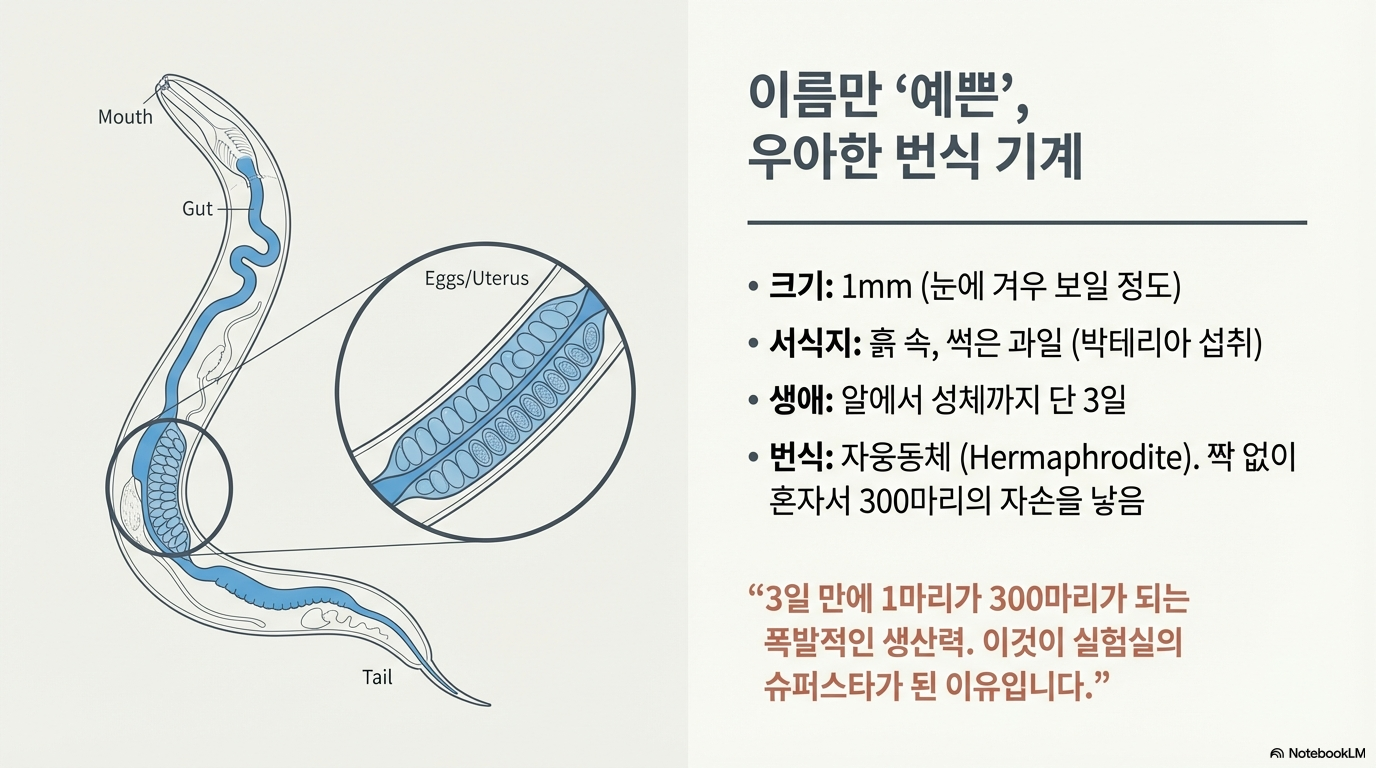 이 벌레의 가장 큰 특징은 바로 생식 방식입니다. 대부분(99.9%)이 암수의 생식기관을 모두 가진 '자웅동체(hermaphrodite)'여서 짝짓기 없이 혼자서 300마리의 자손을 낳을 수 있습니다. 아주 드물게(0.1%) 세포 분열 과정의 '실수'로 수컷이 태어나기도 하지만, 자웅동체의 존재 덕분에 유전 연구는 비교할 수 없이 쉬워집니다.