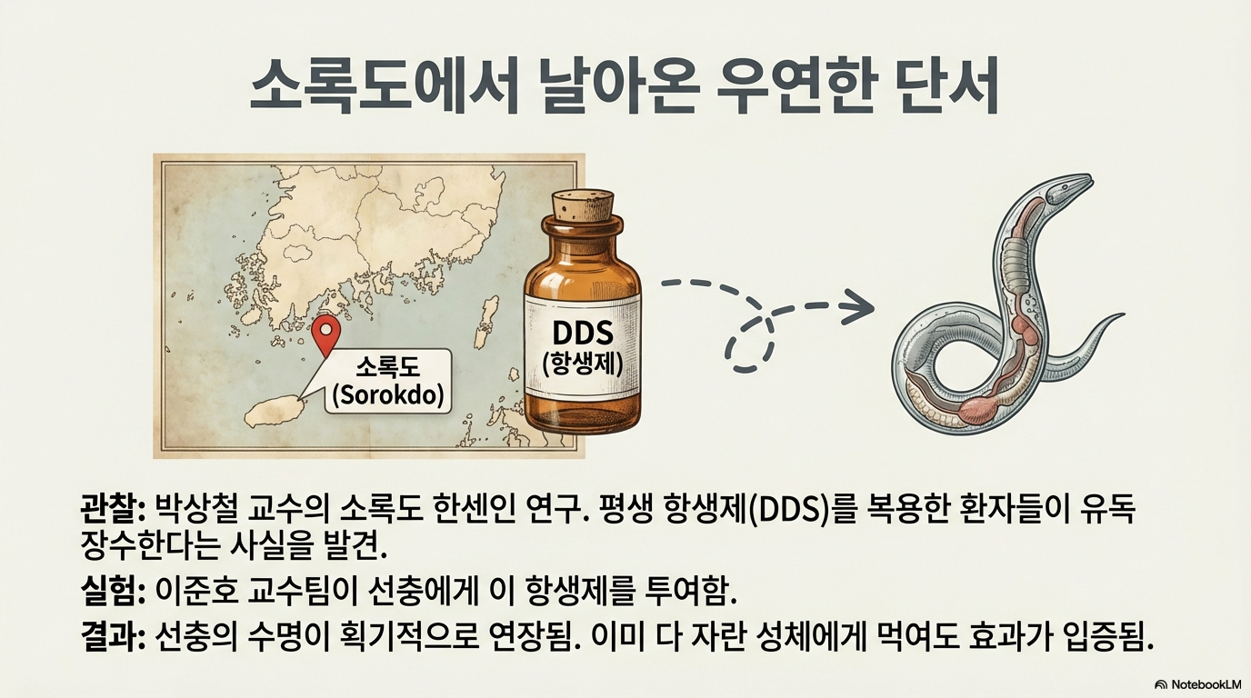 어느 날, 서울대 의대 박상철 교수는 한센병 환자들을 연구하다가 흥미로운 사실을 발견합니다. 한센병 치료용 항생제인 '댑손(Dapsone, DDS)'을 처방대로 단기간 복용한 환자들보다, 재발을 우려해 평생 복용한 환자들이 의미 있을 정도로 더 오래 살았다는 점입니다. 혹시 100년도 더 된 이 낡은 약에 수명 연장의 비밀이 숨어있는 건 아닐까요?