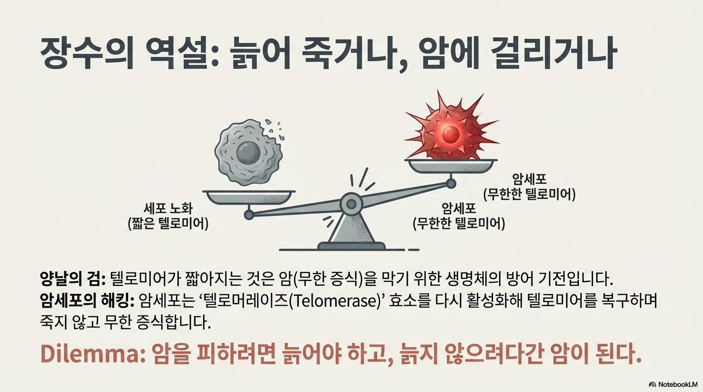 우리 세포의 수명을 재는 생체 시계, '텔로미어'. 하지만 이 텔로미어는 생명의 '양날의 검'과 같습니다. 텔로미어는 염색체 끝을 보호하는 캡으로, 세포가 분열할 때마다 짧아집니다. 이것이 짧아지면 노화가 오지만, 만약 무한히 길어진다면 세포는 불멸성을 얻어 암으로 폭주하게 됩니다.