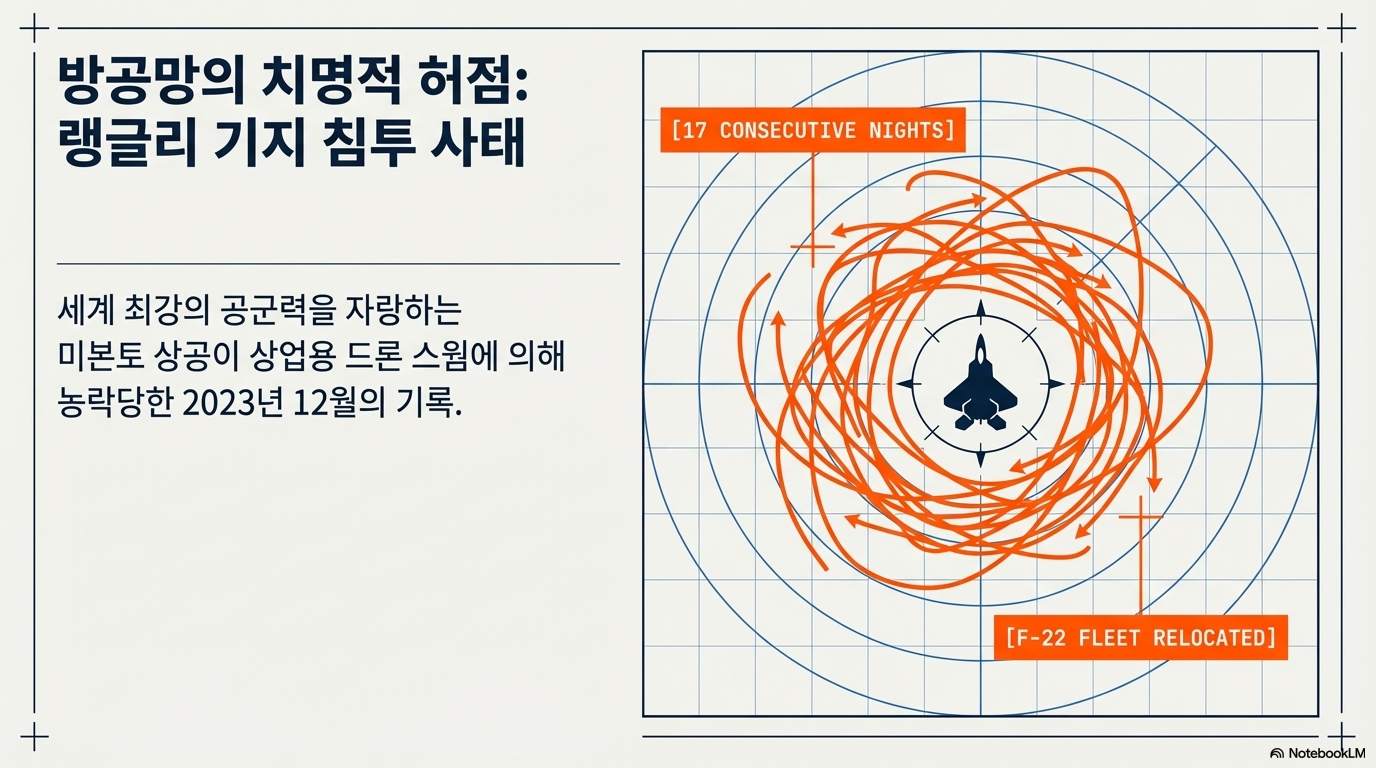 실리콘밸리의 혁신이 절실한 이유는 역설적으로 미국의 안보가 전례 없는 취약점에 노출되었기 때문이다. 최근 버지니아주 랭글리 공군 기지 상공에서 17일 밤 동안 이어진 정체불명의 드론 스웜 침입 사건은 세계 최강 미국의 자존심에 깊은 상처를 남겼다. 미 군 당국은 자국 영공을 유린하는 드론들을 탐지하지도, 막아내지도 못했으며 결국 최첨단 F-22 전투기들을 다른 기지로 피신시켜야 했다.