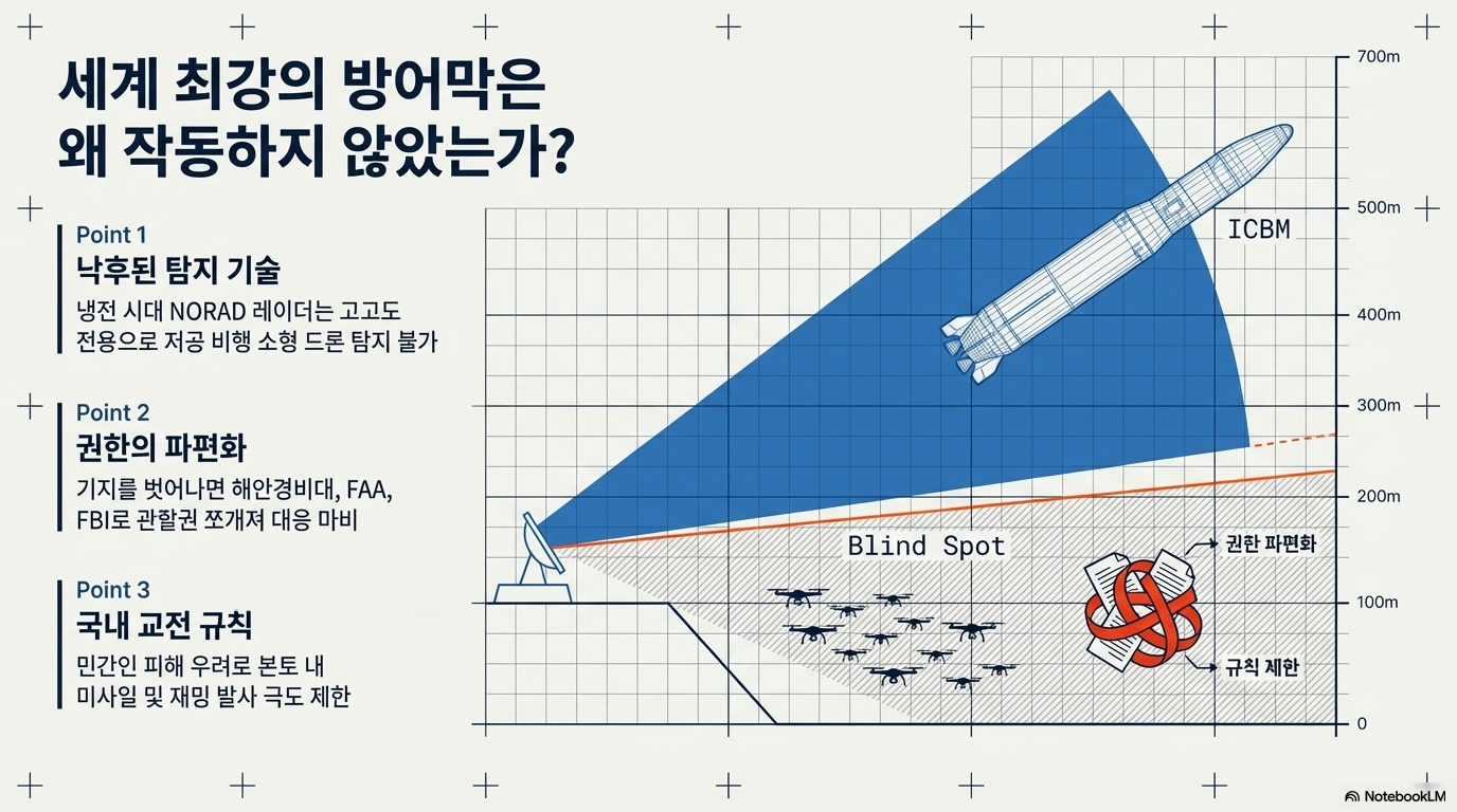 전 NORAD 사령관 글렌 반허크(Glenn VanHerck) 장군은 이 치명적인 '능력 격차(Capability Gap)'의 원인을 뼈아프게 지적했다. 냉전 시대 고고도 미사일 공격을 막기 위해 설계된 기존 레이더 시스템으로는 저고도로 비행하는 소형 드론들을 포착할 수 없었기 때문이다. 대양이라는 천혜의 요새 덕분에 안전하다는 ‘요새 미국(Fortress America)’의 신화는 드론이라는 비대칭적 위협 앞에 처참히 무너졌다.