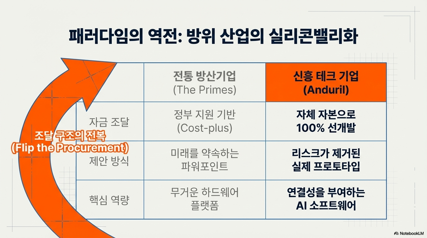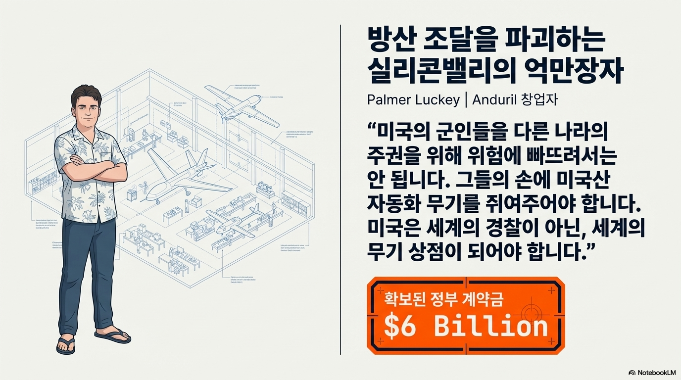 이러한 기술 혁명의 중심에는 앤듀릴(Anduril)의 설립자 팔머 러키(Palmer Luckey) 같은 '실리콘밸리식 파괴자'들이 있다. 하와이안 셔츠에 슬리퍼 차림으로 펜타곤에 나타나는 이 젊은 억만장자는 기존 방산 대기업(Primes)들의 관료주의적 비즈니스 모델을 정면으로 거부한다. 그는 정부 예산으로 느리게 무기를 개발하는 대신, 자기 자본으로 먼저 '제품'을 완성해 제안하는 혁신을 선보였다.