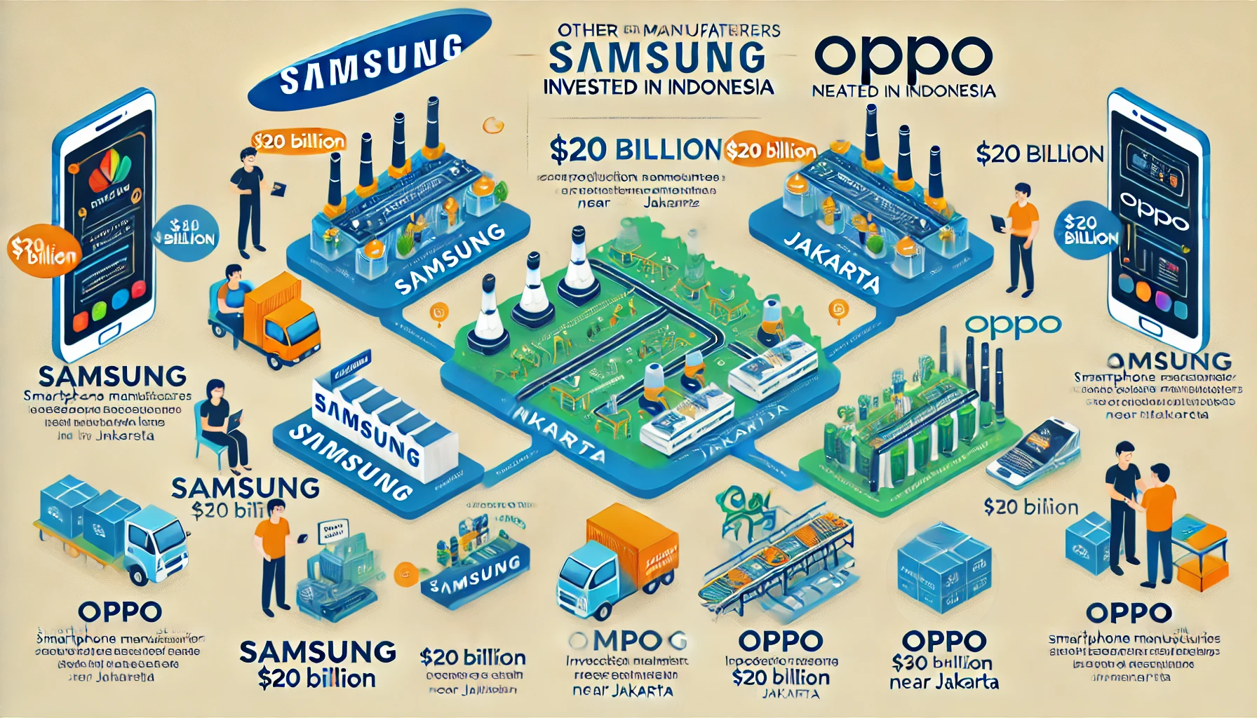 삼성은 최소 200억 달러를 투자해 인도네시아에 공장을 설립했고, 중국의 오포(Oppo) 역시 자카르타 외곽에 공장을 확장하며 인도네시아를 두 번째로 큰 해외 생산 거점으로 활용하고 있습니다.