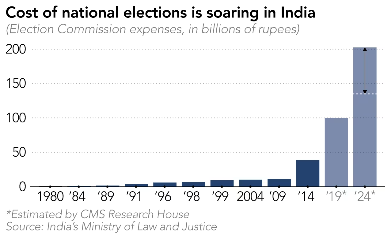 인도의 선거는 그 자체로 엄청난 재정적 부담을 동반합니다. 예를 들어, CMS 리서치 하우스에 따르면 2024년 총선 비용은 약 1조 3,500억 루피(약 22조 원)에 달하며, 이는 2019년 총선 비용(6천억 루피)의 두 배 이상입니다.