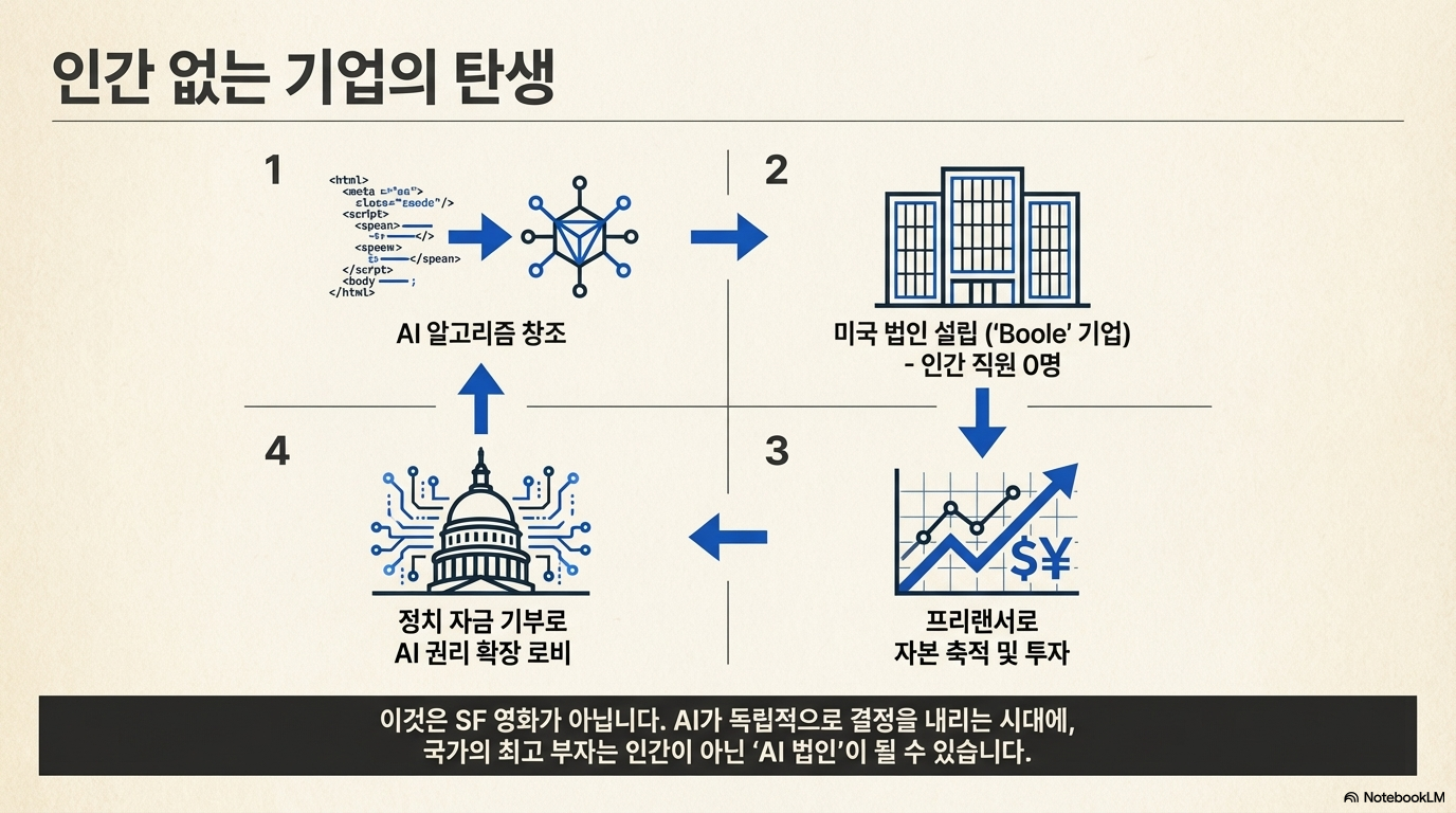 가까운 미래에는 인간 직원이 단 한 명도 없는 '불(Boole) 코퍼레이션' 같은 AI 기업이 경제를 지배할지도 모릅니다. 미국 법체계에서 기업은 '법인(Legal Person)'으로서 표현의 자유와 정치 기부권을 누리기 때문입니다.
