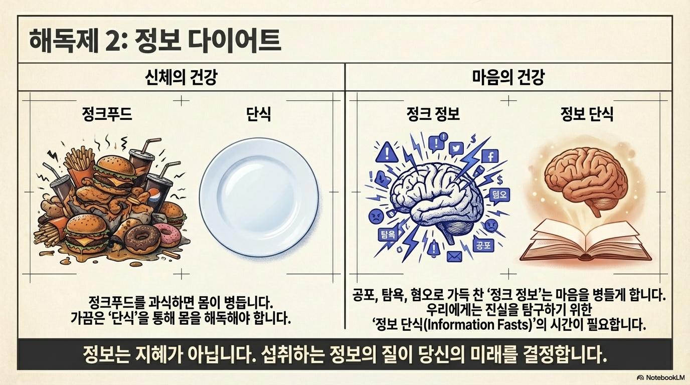 - 질적인 정보 소비: 정크푸드를 멀리하듯 마음을 병들게 하는 정보를 걸러내야 합니다. 때로는 정보를 완전히 차단하고 마음을 해독하는 **'정보 단식(Information Fasting)'**의 시간이 필요합니다.