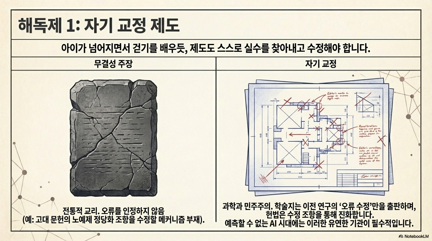 하라리가 제시하는 해법의 핵심은 **'자기 수정 기제(Self-correcting mechanism)'**를 가진 제도를 복원하는 것입니다.