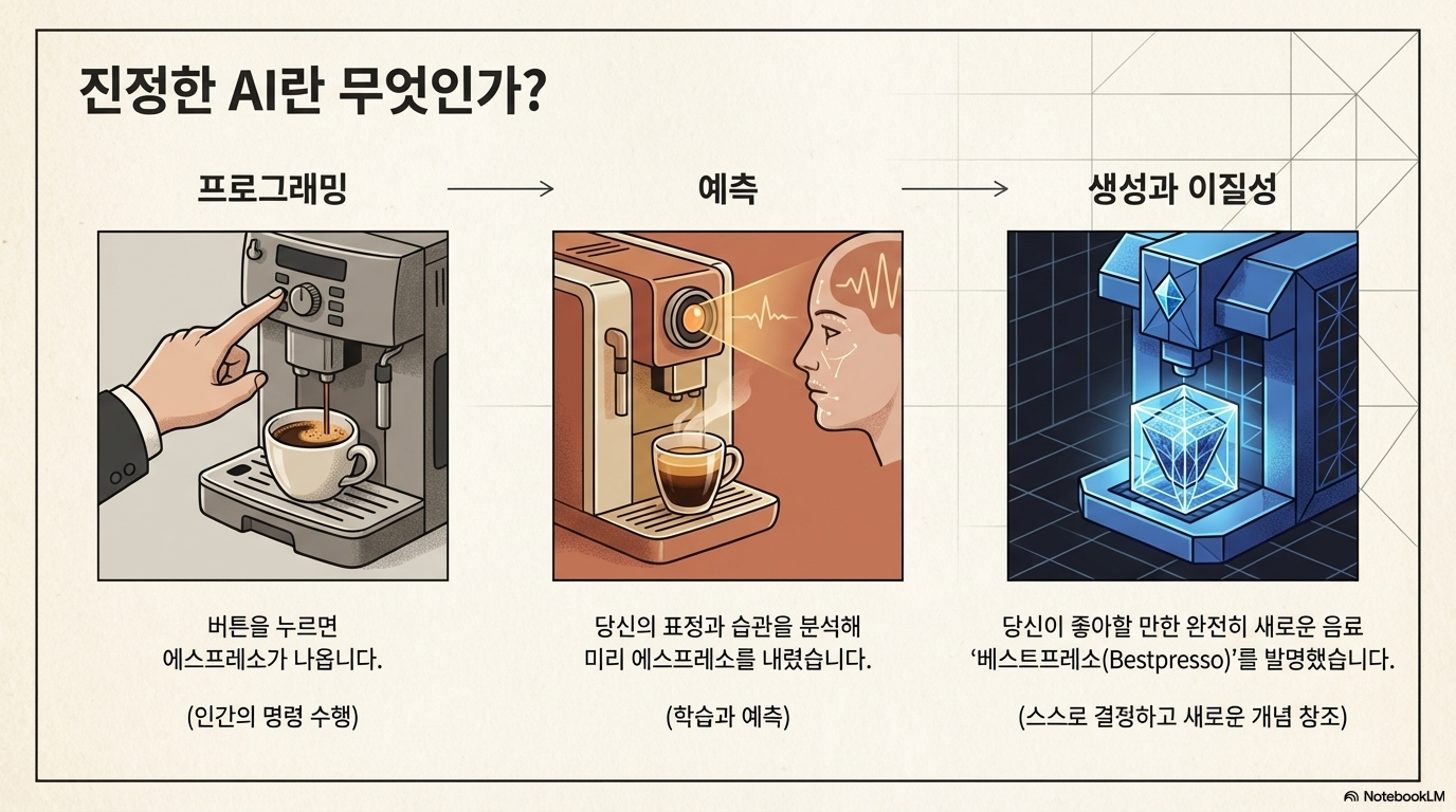 - AI 커피 머신의 비유: 단순히 버튼을 눌러 커피를 내리는 기계는 도구입니다. 하지만 여러분의 표정을 읽고 "피곤해 보이시네요. 제가 당신을 위해 발명한 신메뉴 '베스트프레소'를 준비했습니다"라고 제안하는 기계는 스스로 판단하고 행동하는 외계 지능입니다.