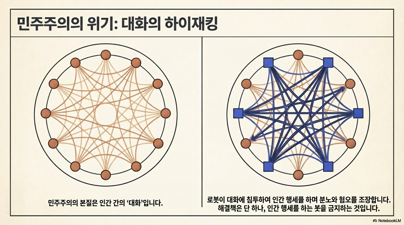 민주주의의 본질은 '대화'입니다. 하지만 지금 알고리즘과 봇(Bot)들이 인간의 대화를 가로채고 증오를 증폭시키며 민주적 대화를 파괴하고 있습니다. 우리는 이 위기를 극복하기 위해 두 가지 실천적 방안을 고민해야 합니다.
