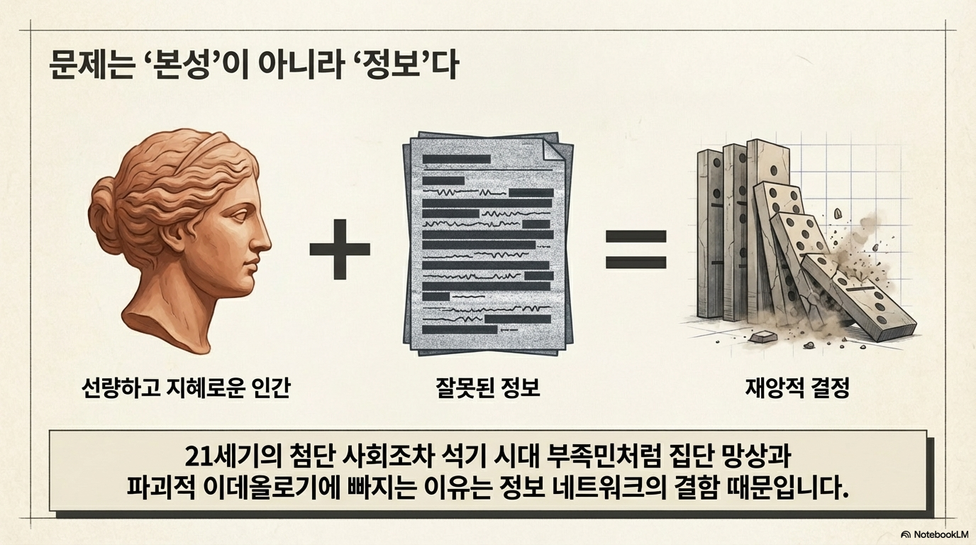 20세기의 스탈린주의나 나치즘 같은 파괴적인 이데올로기는 단순히 '나쁜 사람들'의 작품이 아닙니다. 라디오와 전신 같은 당시의 현대적 정보 기술이 대중을 광기로 몰아넣는 '정보 기반의 대재앙'을 가능케 했기 때문입니다. 아무리 좋은 의도를 가진 사람이라도 나쁜 정보가 주어지면 나쁜 결정을 내릴 수밖에 없습니다. 인류의 기술은 비약적으로 발전했지만, 정보의 품질을 걸러내는 시스템은 여전히 석기시대 수준의 취약함을 벗어나지 못했습니다.