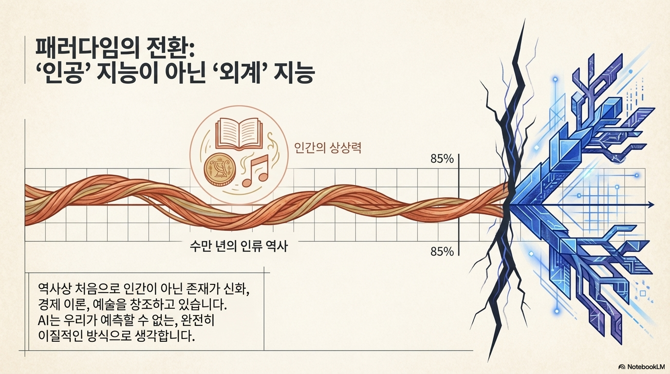 우리는 AI를 인간이 통제하는 도구(Artificial)로 착각하지만, 하라리는 AI를 예측 불가능한 **'외계 지능(Alien Intelligence)'**으로 재정의합니다. AI는 인류 역사상 최초로 스스로 결정을 내리고 새로운 이야기를 창조할 수 있는 비유기적 실체이기 때문입니다.