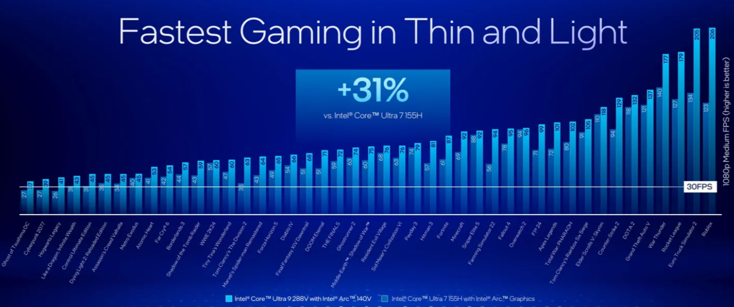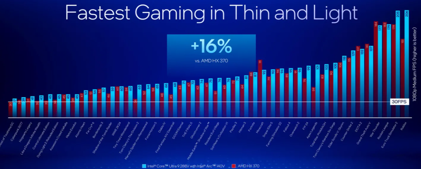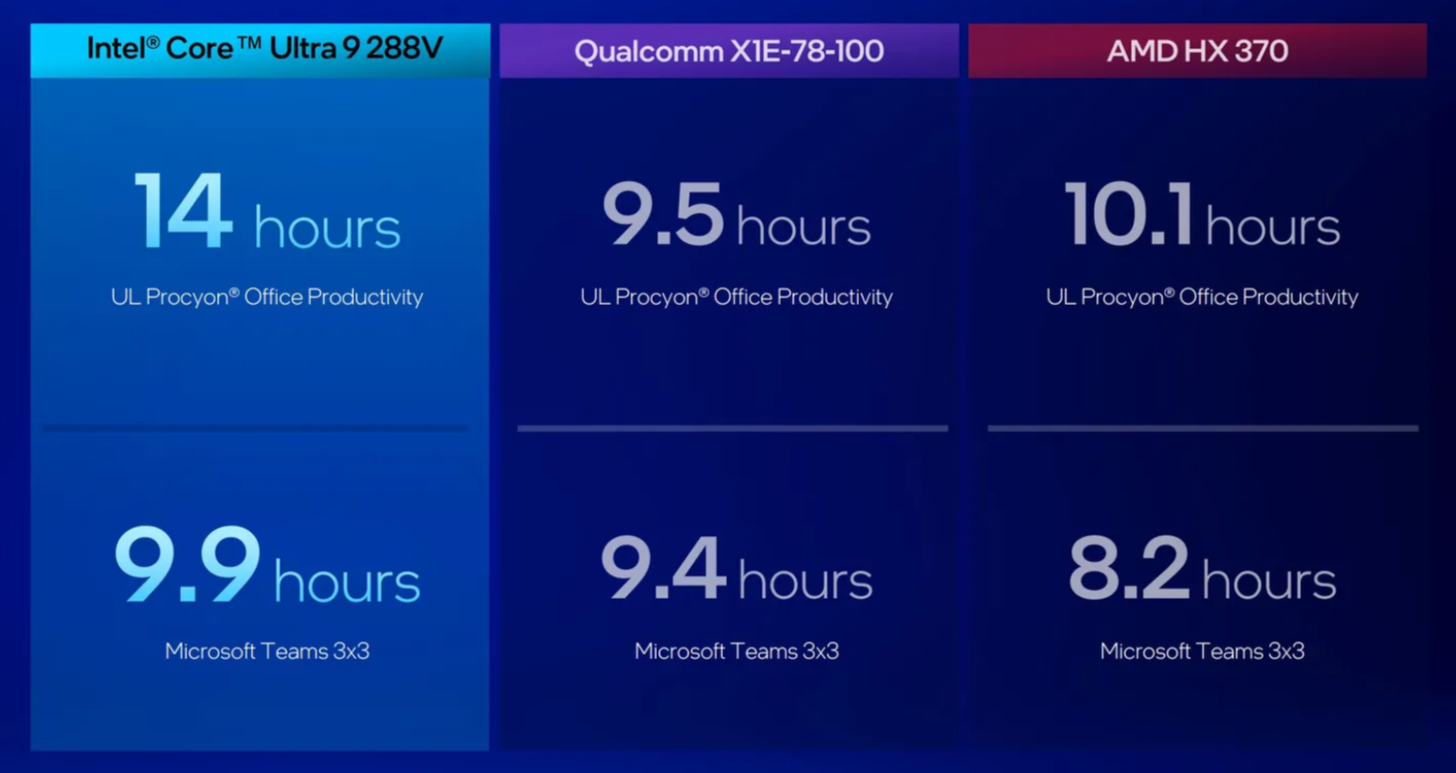 또한, Asus Zenbook S 14 모델은 AMD Strix Point 기반의 Zenbook S 16보다 더 적은 배터리 용량을 가졌음에도 불구하고 사무 작업에서 더 긴 배터리 수명을 자랑합니다. 이 외에도 게임 성능에서 인텔은 AMD를 넘어 Qualcomm을 크게 앞지른다고 주장하며, Core Ultra 9 288V 모델은 Qualcomm X1E-84-100과 비교해 68% 더 나은 프레임 속도를, AMD HX 370과 비교해 16% 더 나은 성능을 보여준다고 합니다.