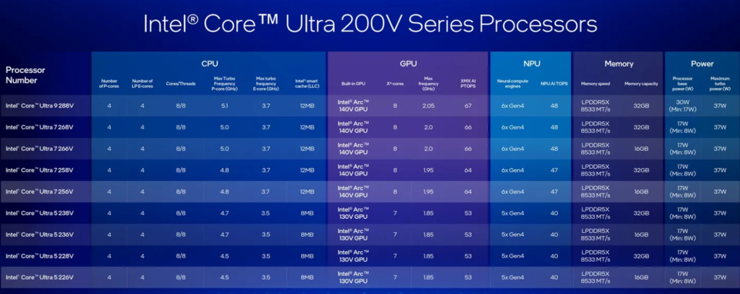 인텔은 Core i3, i5, i7의 전통적인 구분 방식을 Lunar Lake에서는 폐기했습니다. 모든 모델은 동일한 코어 수를 가지며, GPU 코어와 AI 엔진의 수만 조금씩 다릅니다. 예를 들어, Core Ultra 7 258V는 8개의 GPU 코어와 6개의 AI 엔진을 가지고 있습니다. 반면, Core Ultra 9 모델은 기본 전력 소모가 더 높아 더 나은 성능을 제공합니다.