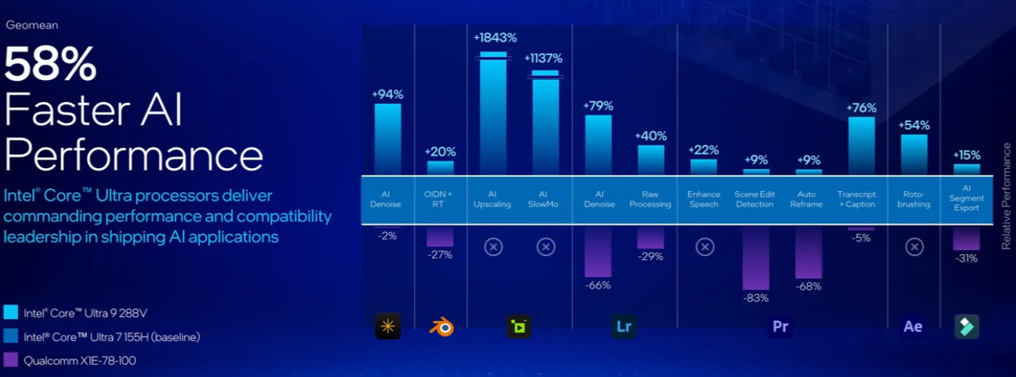 Lunar Lake 기반 노트북은 AI 성능에서도 두각을 나타냅니다. 인텔은 Adobe Premiere 및 Lightroom과 같은 애플리케이션에서 Qualcomm보다 더 빠른 AI 성능을 제공할 것이라고 밝혔습니다. 또한 Wi-Fi 7, Bluetooth 5.4, 최소 두 개의 Thunderbolt 4 포트를 제공해 빠른 USB-C 연결, 충전, 그리고 최대 세 대의 4K 모니터 지원이 가능합니다.