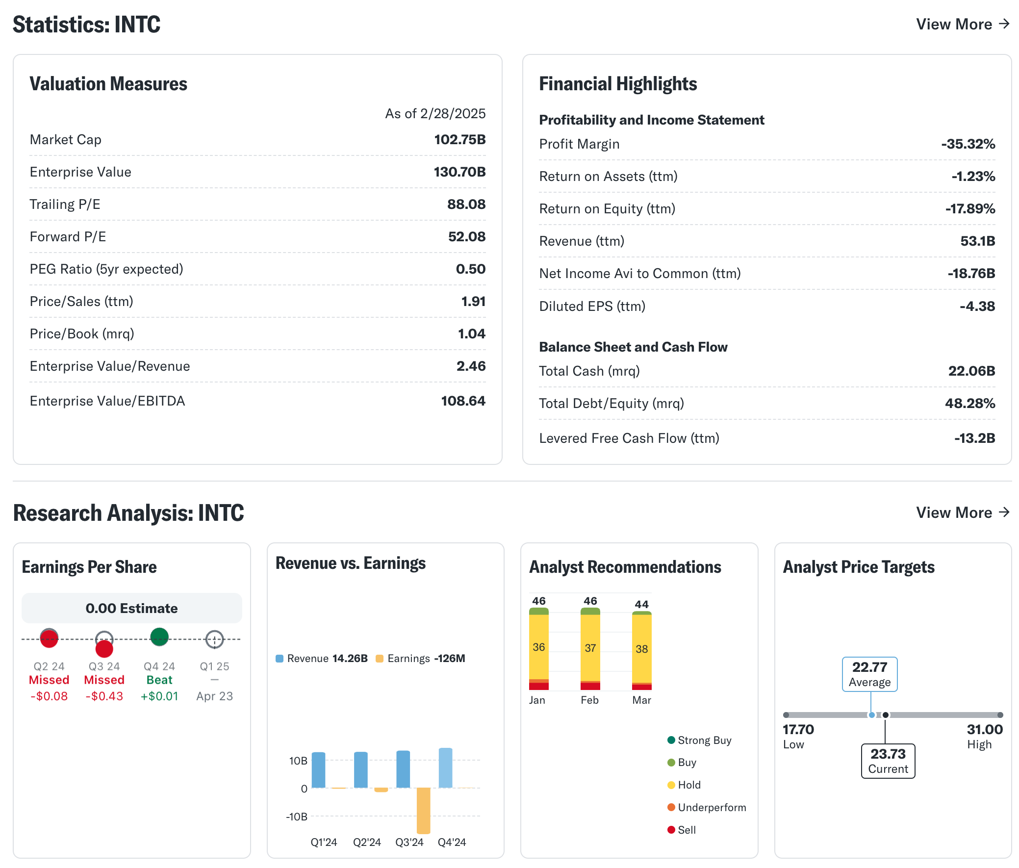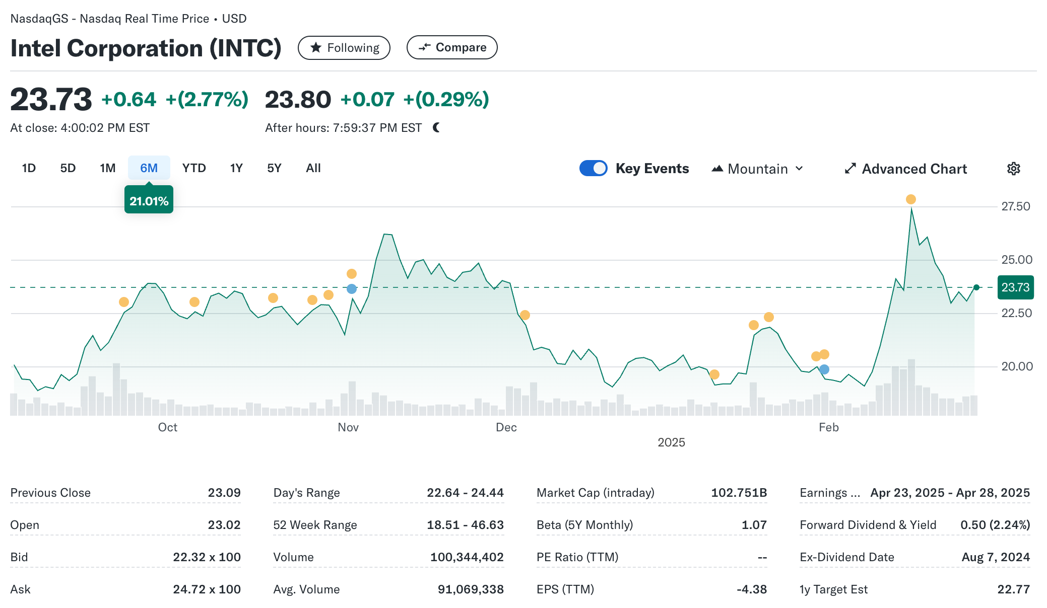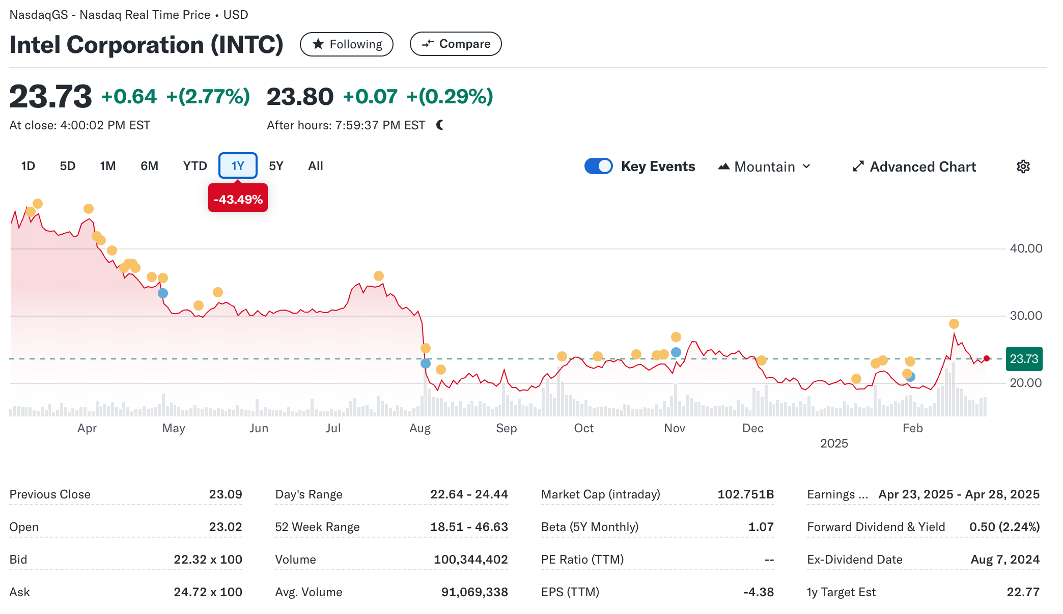 - 인텔의 주가는 최근 1년 동안 거의 50% 가까이 하락했다.