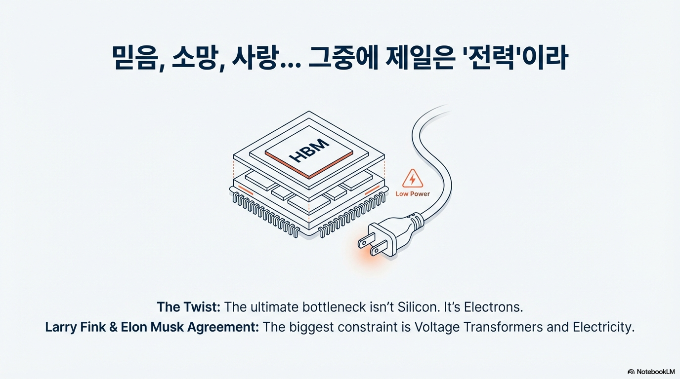대부분의 사람들은 AI 시대의 가장 큰 병목 현상을 '반도체 칩' 공급에서 찾습니다. 하지만 일론 머스크는 더 근본적이고 치명적인 아킬레스건을 지목했습니다. AI 모델 구현의 가장 큰 제약 요인이 무엇이냐는 질문에 그의 대답은 의외였습니다.