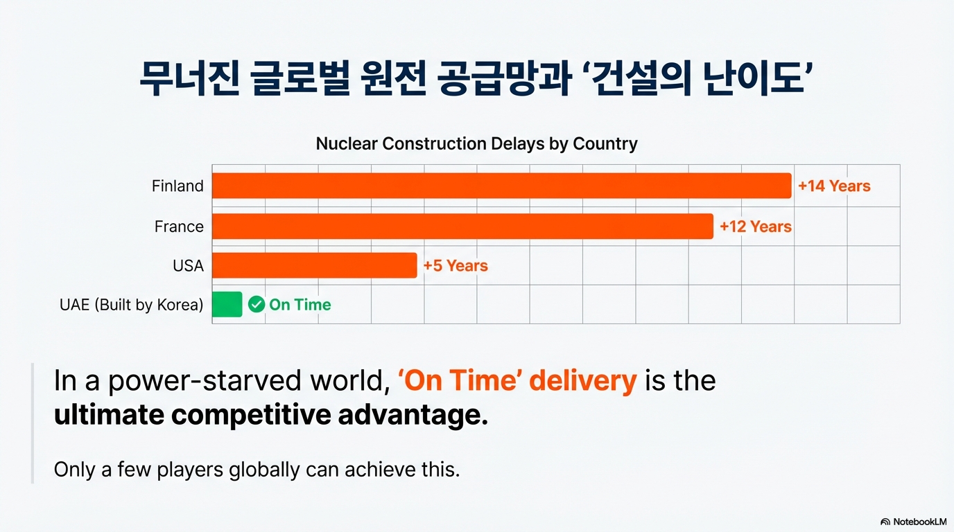 머스크의 통찰은 간단하고 명료합니다. 아무리 많은 반도체 공장을 짓고 데이터 센터를 구축해도, 그것을 가동할 '전력'이 없다면 모든 것이 무용지물이라는 것입니다. 그는 심지어 이렇게 경고했습니다. "칩보다도 전력이 없어서 (컴퓨터를) 켜지 못할 거래요." 이 경고가 무서운 이유는 명확한 시간차 때문입니다. 반도체 공장 증설보다 발전소를 짓고 전력망을 구축하는 데 훨씬 더 오랜 시간이 걸립니다. 결국 전력 부족이 AI 산업 전체의 발목을 잡는 궁극적인 브레이크가 될 수 있다는 분석입니다.