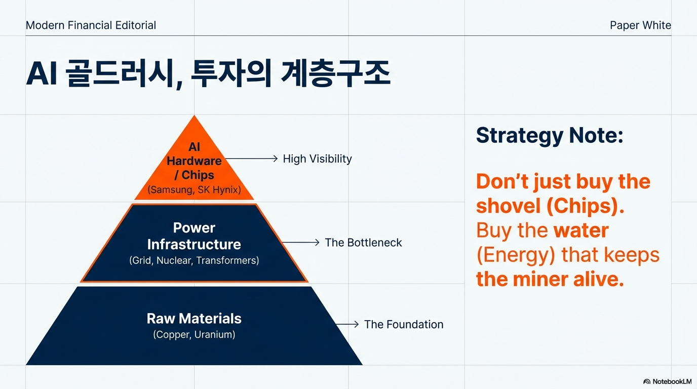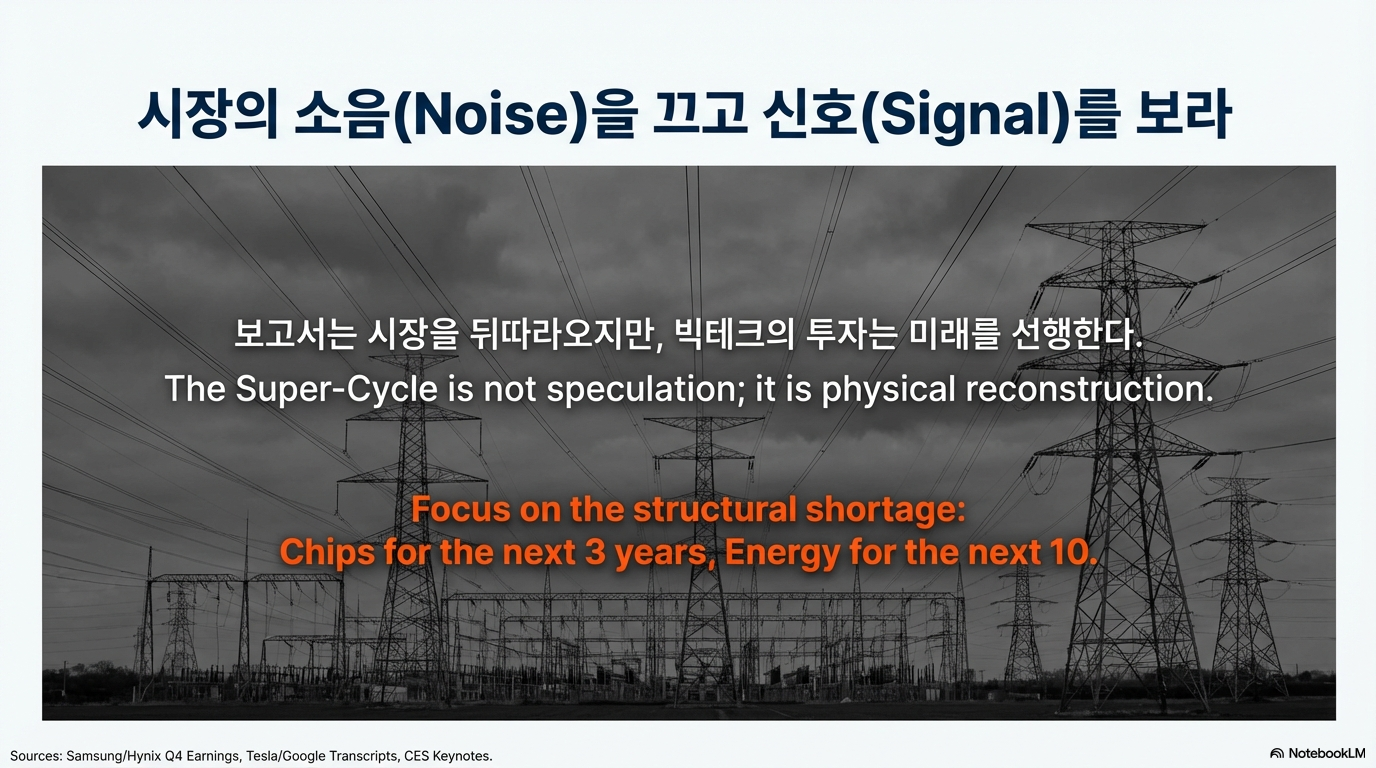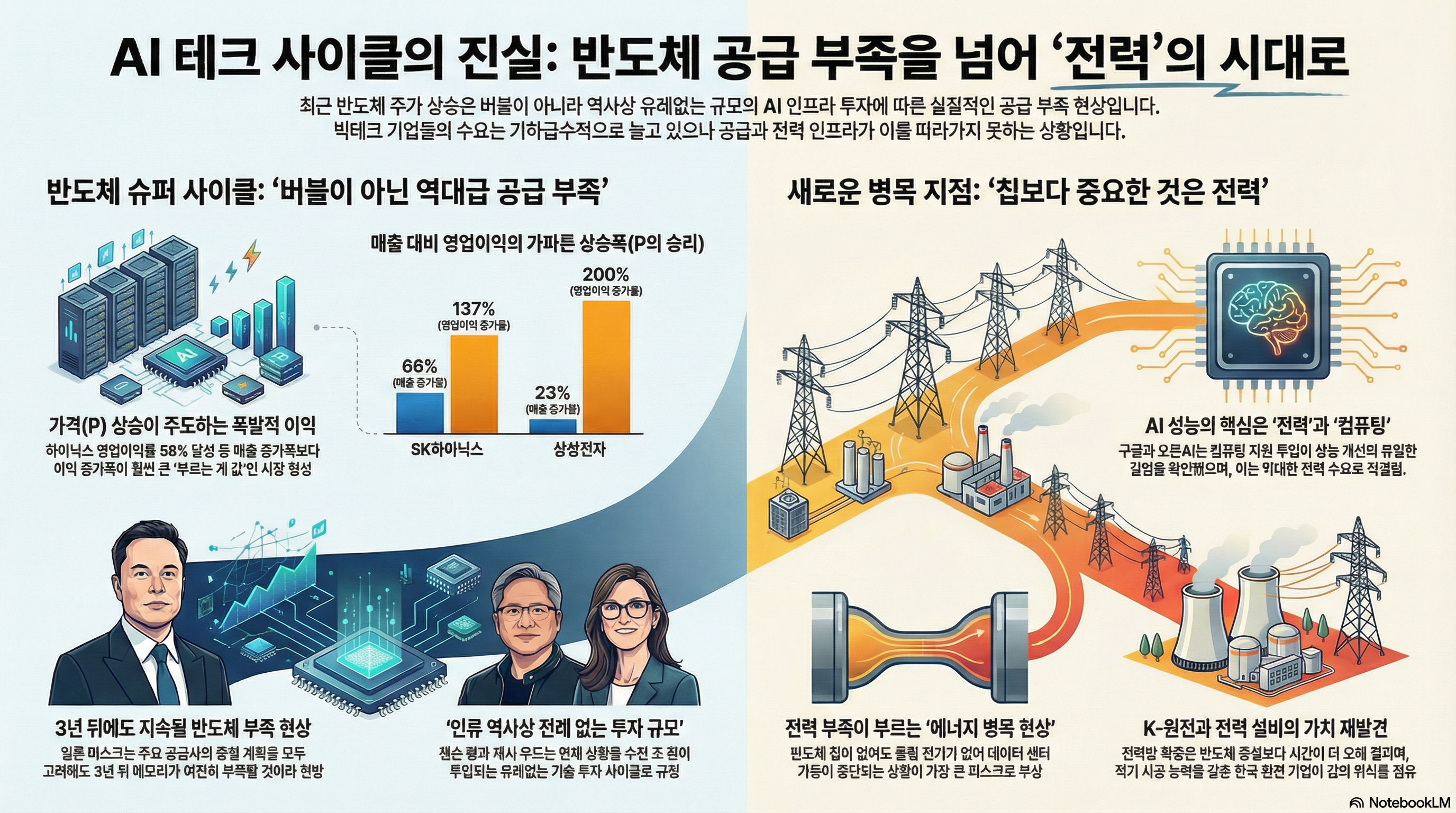 시장의 소음에 가려져 있던 5가지 진실은 하나의 방향을 가리키고 있습니다. '버블'이라 불렸던 시장은 폭발적인 이익 성장의 초입이었고, 반도체 부족은 '3년 이상' 지속될 장기적인 현실이며, 투자의 규모는 '인류 역사상 전례 없는' 수준입니다. 그리고 이 모든 것을 제약하는 최종 병목은 반도체가 아닌 '전력'이며, 컴퓨팅 수요는 '5년 내 1000배'라는 상상 초월의 속도로 팽창하고 있습니다.