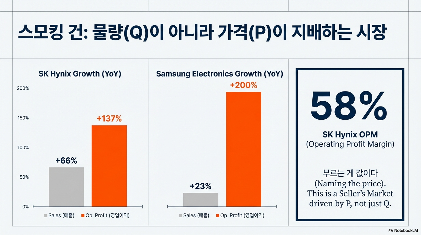 지금의 상승은 막연한 기대감이 아닌, 반도체 산업에서 터져 나오는 폭발적인 이익에 기반하고 있습니다. 최근 실적 발표에서 SK하이닉스는 매출이 66% 증가하는 동안 영업이익은 137% 폭증했고, 삼성전자 역시 매출 23% 증가에 영업이익은 200%나 급증했습니다. 매출 증가율을 압도하는 이익의 성장은 '가격을 부르는 대로 팔 수 있는' 강력한 수요가 시장을 이끌고 있음을 보여줍니다. SK하이닉스의 영업이익률이 58%에 달하는 것은 마치 제조업이 아니라 주점이나 커피숍을 운영하는 것과 같습니다. ‘하이닉스’가 아니라 ‘하이닉스 주점’인 셈입니다. 우리가 버블이라 여겼던 지점은 어쩌면 거대한 변화의 시작점에 불과했을지 모릅니다.