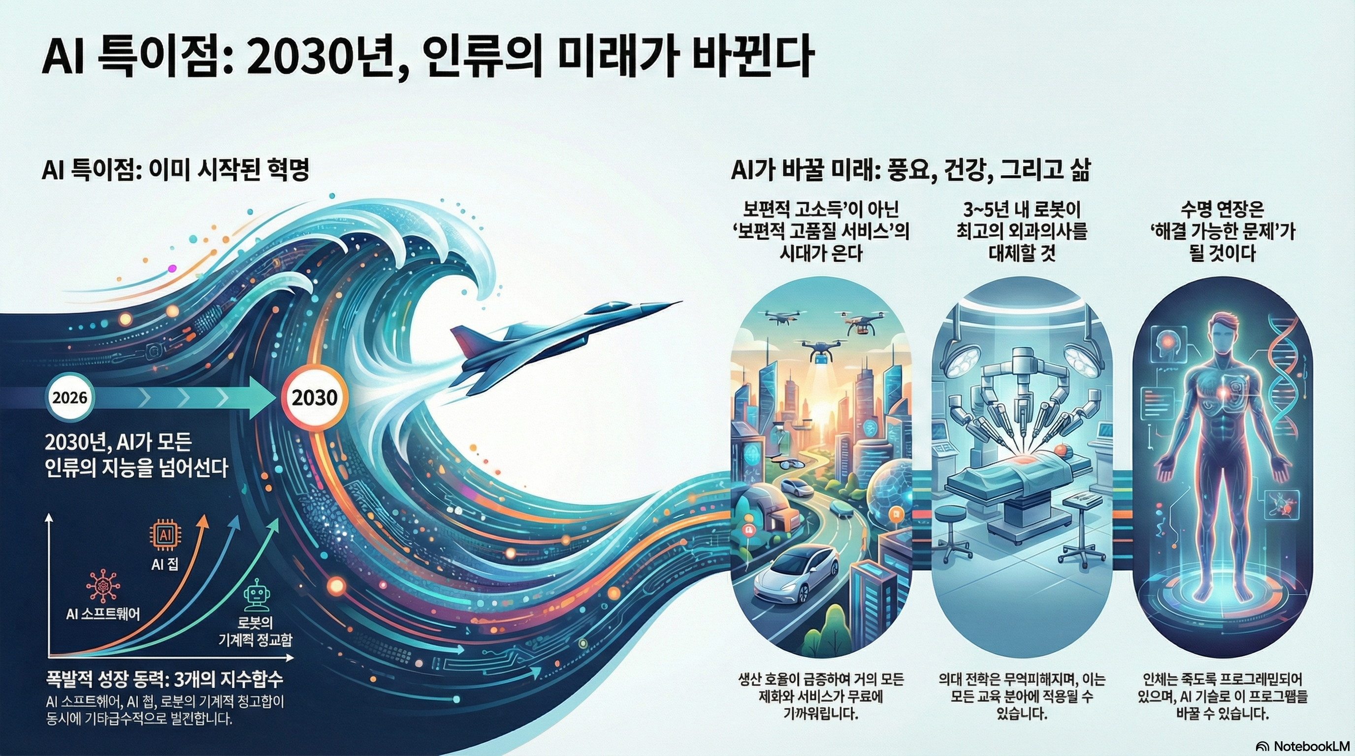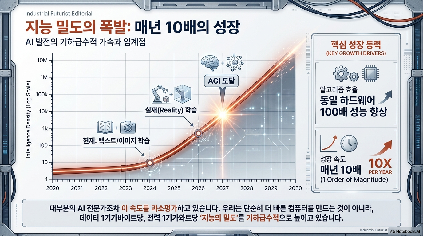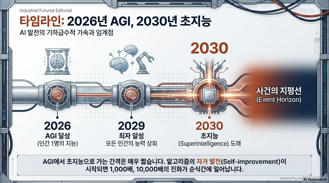 많은 사람이 AI 특이점(Singularity)을 먼 미래의 일로 생각하지만, 대담에서는 우리가 '이미 특이점 안에 들어와 있다'는 진단이 나옵니다. AI와 로보틱스의 발전 속도는 해안가로 밀려오는 거대한 '초음속 쓰나미'에 비유될 만큼 빠르고 파괴적입니다. 구체적으로, 범용인공지능(AGI)이 2026년에 등장할 수 있으며, 2030년에는 AI의 지능이 인류 전체의 지능을 합친 것을 능가할 것이라는 예측은 이 변화가 얼마나 긴급하고 임박한 문제인지를 보여줍니다. 이 타임라인은 더 이상 10년 단위의 장기 전략이 무의미하며, 지금 당장 비상한 대응이 필요하다는 강력한 시그널입니다.