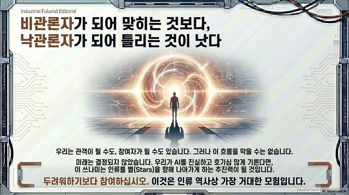 이제 질문은 우리에게 돌아옵니다. 경제, 직업, 그리고 삶과 죽음의 규칙마저 완전히 새로 쓰이는 세상에 우리는 과연 어떤 전략을 세워야 할까요? 우리 해안가로 밀려오는 '초음속 쓰나미' 앞에서 기존의 지도를 고집할 것인가, 아니면 완전히 새로운 항해술을 개척할 것인가. 리더와 전략가, 그리고 우리 모두가 답해야 할 시간입니다.