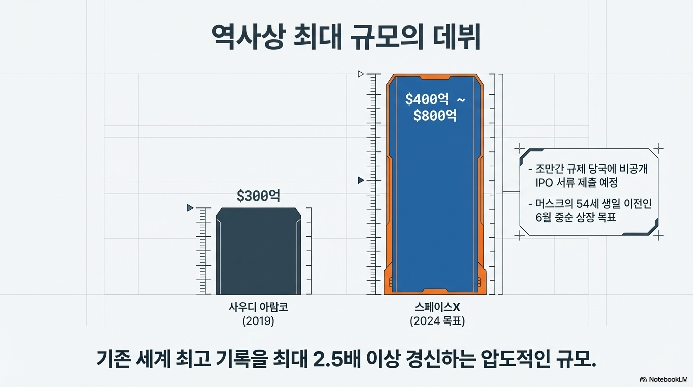 SpaceX의 예상 조달 규모는 400억 달러에서 800억 달러 사이로 추정되며, 이는 2019년 사우디 아람코(Saudi Aramco)가 세운 300억 달러의 기록을 경신하는 역사상 최대 규모의 상장이 될 전망입니다.