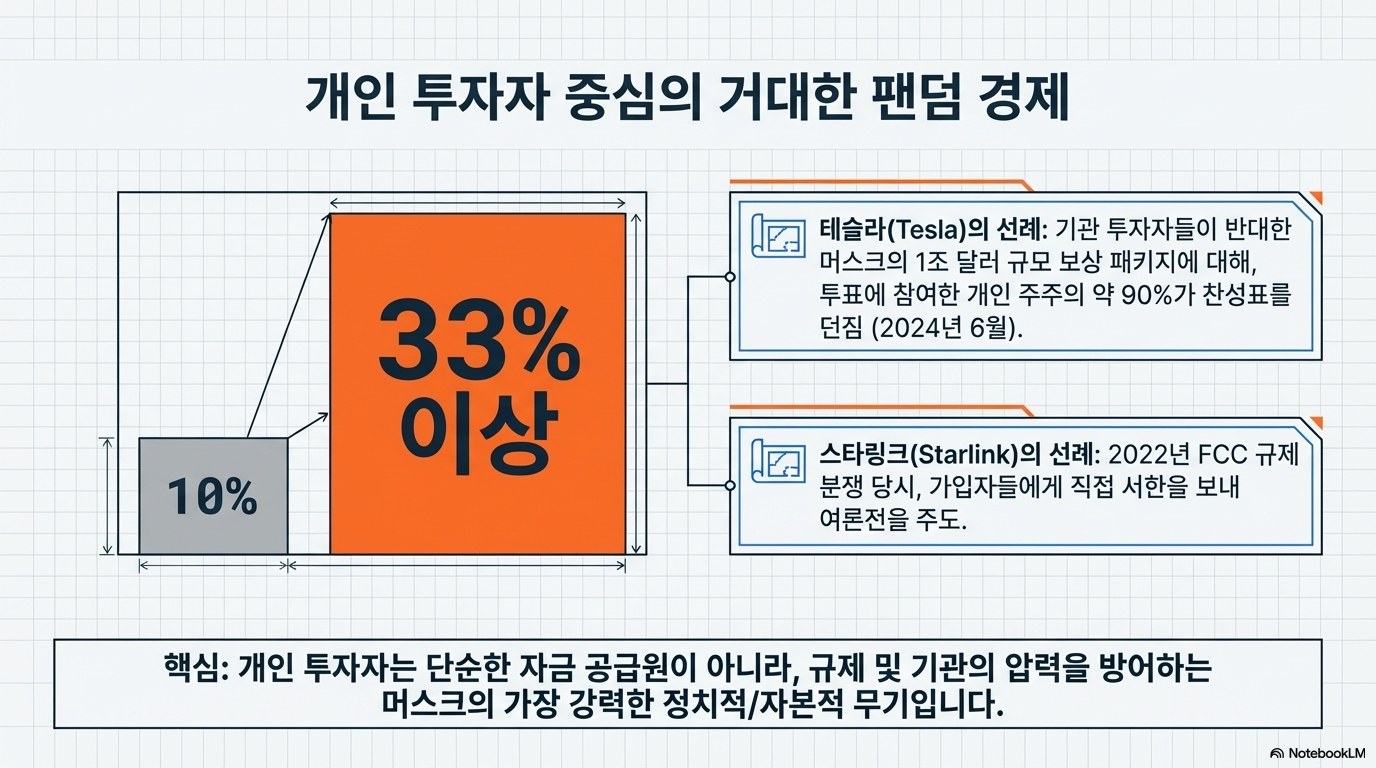 머스크의 세계관에서 자본은 단순한 숫자가 아닌 '신뢰의 증표'입니다. 그는 이번 IPO에서 기관 투자자들의 영향력을 억제하고 자신을 지지해 온 개인 투자자(Retail Investors)들의 지배력을 강화하는 전략을 선택했습니다.