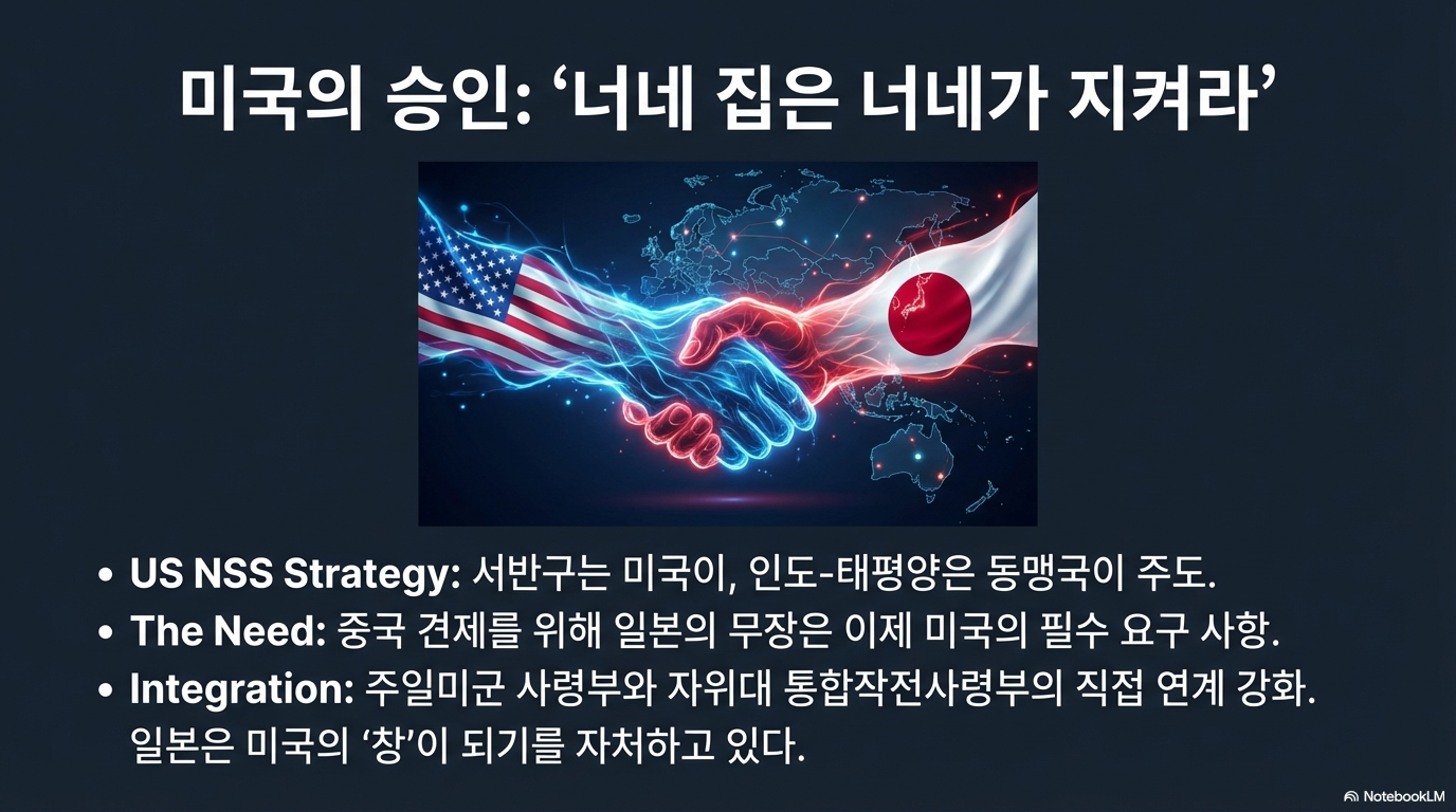 일본의 군사대국화는 주변국의 우려를 사지만, 정작 미국은 이를 적극적으로 독려하고 있습니다. "너희의 안보는 너희가 책임지라"는 미국의 방위 부담 분담 전략과 일본의 재무장 욕구가 맞물린 결과입니다.