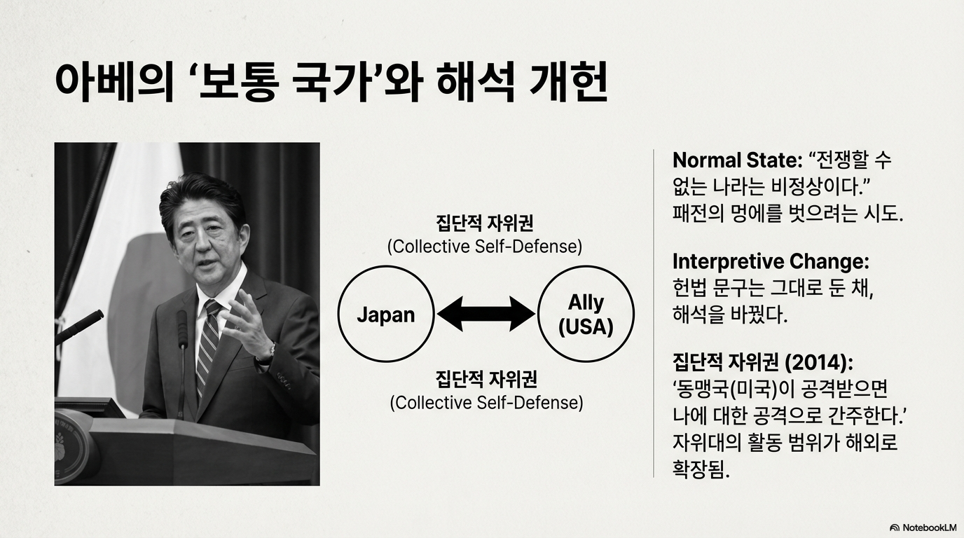 • 아베의 해석 변경: 2012년 아베 정권은 '능동적 평화주의'를 내세워, 동맹국이 공격받을 때도 무력을 행사할 수 있는 '집단적 자위권'을 도입했습니다. 헌법을 바꾸지 않고 해석만으로 군사 활동의 빗장을 푼 것입니다.