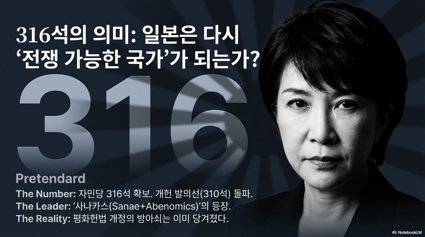 하지만 그 이면에 서린 메시지는 서슬 퍼런 칼날처럼 날카롭습니다. ‘강하고 번영하는 일본’을 외치며 평화헌법 개정을 주장하는 그녀의 행보는 단순한 정치적 수사를 넘어, 일본 사회의 거대한 우경화 흐름을 상징하고 있습니다. 특히 이번 선거에서 자민당이 확보한 '316석'이라는 숫자는 일본이 수십 년간 유지해 온 평화 국가의 틀을 깨뜨릴 수 있다는 강력한 경고장을 던지고 있습니다.