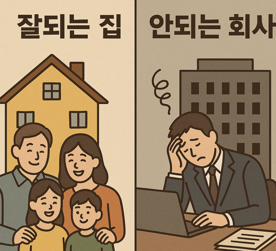 이 문장에는 가정과 조직의 본질적인 차이가 숨어 있다. 집은 사람의 관계로 이루어지고, 회사는 시스템과 방향으로 움직인다. 그래서 ‘되는 이유’와 ‘안 되는 이유’의 패턴이 서로 반대가 된다.